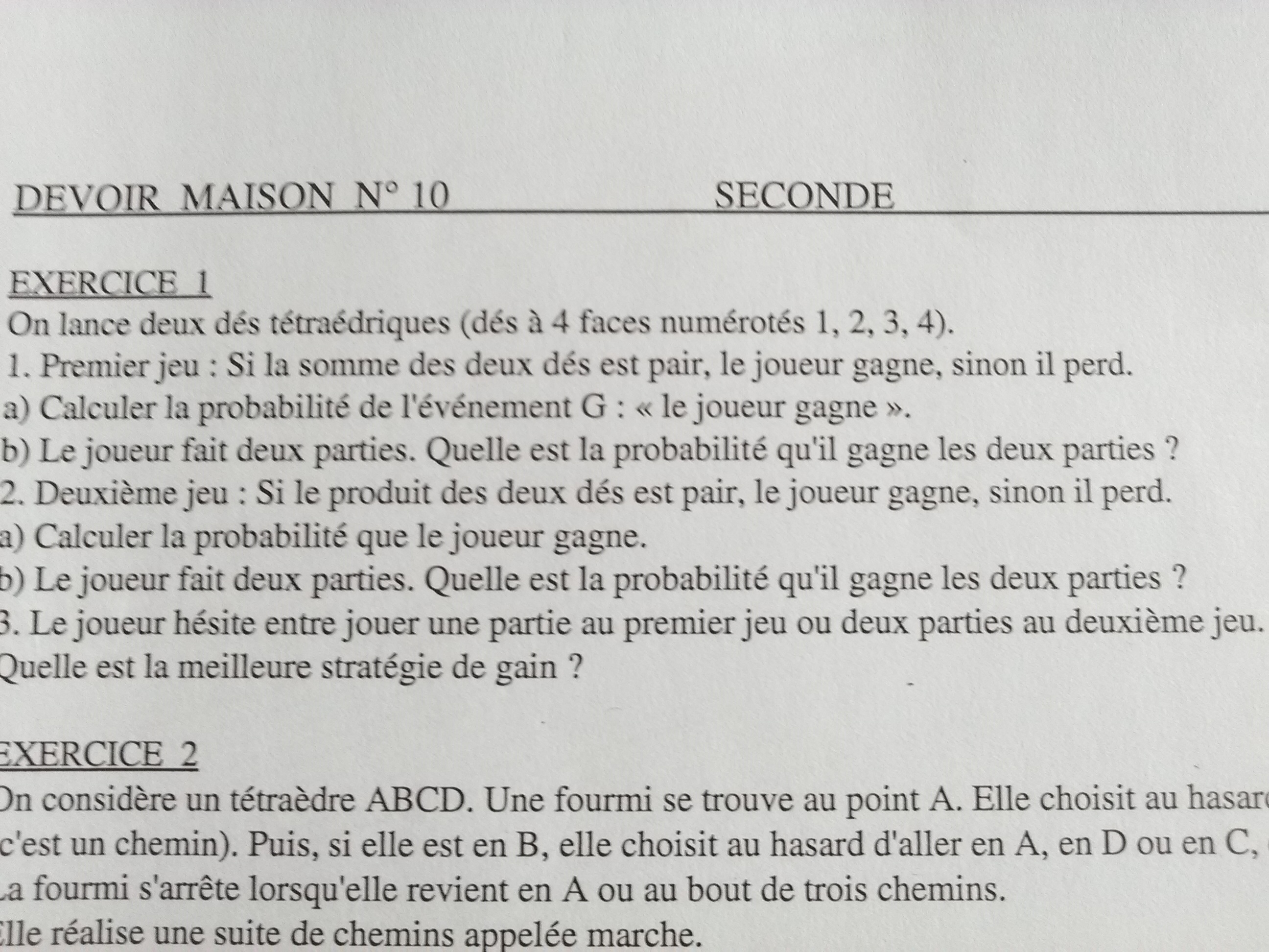 E-Bahut pzorba75 Posté(e) le 11 avril 2016 E-Bahut Signaler Posté(e) le 11 avril 2016 En probabilités, il faut justifier ses réponses et dans le cas de ces deux dés, il faut faire un tableau à double entrée (ou un arbre moins lisible) montrant la somme obtenue. Pour d'exercice 2, le sujet est incomplet, mal cadré.