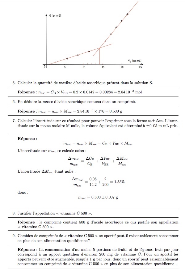 paul.azer Posté(e) le 11 avril 2016 Signaler Posté(e) le 11 avril 2016 Bonjour, j'ai des difficultés pour cet exercice, pourriez-vous m'aider svp. Merci d'avance pour votre aide. L’acide ascorbique, de formule brute C6H8O6, appelé communément Vitamine C est un antioxydant qui joue un rôle important dans le métabolisme de l’être humain, il aide notamment les personnes à résister aux infections, à lutter contre la fatigue. Les apports journaliers recommandés (AJR) en vita- mine C sont de 60 mg pour un adulte, mais ces apports peuvent être largement augmentés, jusqu’à 1 g pour un sportif. L’acide ascorbique se trouve principalement dans les citrons, les jus de fruits et les légumes frais. Généralement, la consommation d’au moins 5 portions de fruits et de légumes frais par jour corres- pond à un apport d’environ 200 mg de vitamine C, ce qui permet de combler largement les apports journaliers recommandés. Il est vendu dans le commerce sous forme de comprimé (ou de poudre orangée), essentiellement constituée d’acide ascorbique. Un sportif qui a une alimentation équilibrée désire prendre un comprimé de vitamine C en complé- ment. Ayant perdu la notice du comprimé, il décide de déterminer expérimentalement la masse d’acide ascorbique présente dans un comprimé. Pour cela, il met en œuvre le protocole suivant : ▶ dissoudre le comprimé de vitamine C dans 250 ml d’eau distillée pour obtenir une solution S. ▶ doser la totalité de la solution S par une solution d’hydroxyde de sodium (Na+(aq)+HO-(aq)) de concentration molaire CB = 0,200 ± 0,002 mol. L-1. questions : 1) Quel est le réactif titrant ? le réactif titré ? 2) Écrire l’équation de la réaction de support du dosage. 3) Donner la relation entre nasc, CB et VBE (volume de soude versé à l’équivalence). 4) Déterminer, sur la courbe du titrage, le volume VBE de solution titrante d’hydroxyde de sodium ajouté à l’équivalence (faire apparaître les traits de construction). 5) Calculer la quantité de matière d’acide ascorbique présent dans la solution S. 6) En déduire la masse d’acide ascorbique contenu dans un comprimé. Calculer l’incertitude sur ce résultat pour pouvoir l’exprimer sous la forme m ± ∆m. 7) L’incertitude sur la masse molaire M nulle, le volume équivalent est déterminé à ± 0,05 mL près. 8) Justifier l’appellation « vitamine C 500 ». 9) Combien de comprimés de « vitamine C 500 » un sportif peut-il raisonnablement consommer en plus de son alimentation quotidienne ?