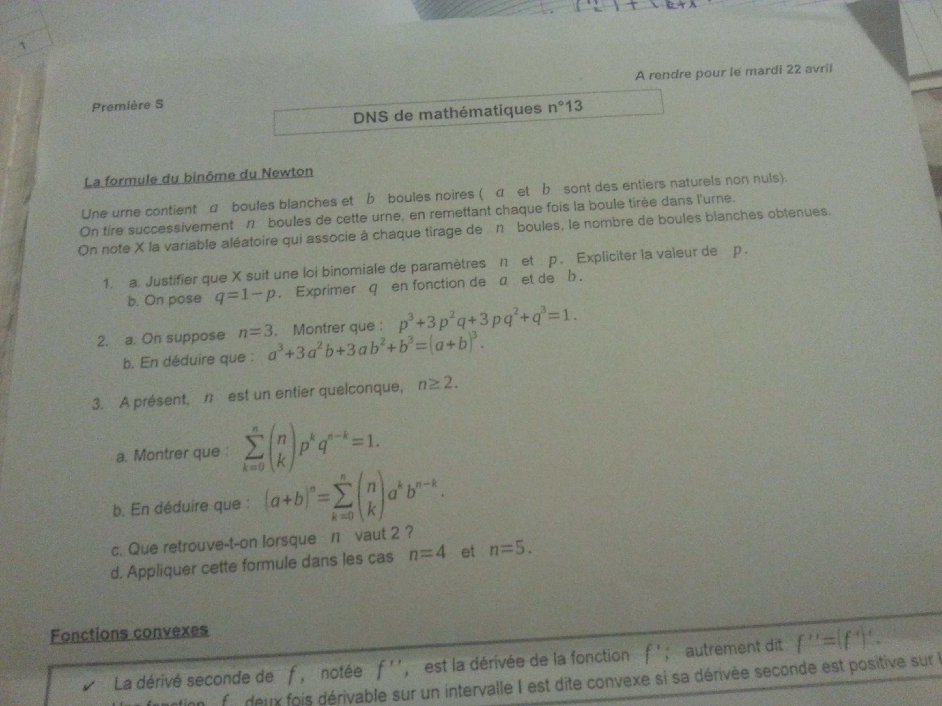 E-Bahut pzorba75 Posté(e) le 12 avril 2016 E-Bahut Signaler Posté(e) le 12 avril 2016 p=a/(a+b), q=b/(a+b) tout le bla-bla sur la loi binomiale et p(X=k)=binom{n,k)pk(1-p)n-k. p(X=0)+p(X=1)+...+p(X=3)=1=>p3+3p2q+2pq2+q3=1 en forçant un peu les calculs avec p=a/(a+b), q=b/(a+b) a3+3a2b+2ab2+b3=1 idem pour p(X=0)+p(X=1)+...+p(X=n)=1 (rédaction par récurrence si tu as du courage, par surprise) Au travail. Je n'irai pas plus loin, je n'ai pas d'appareil photo pour la suite.