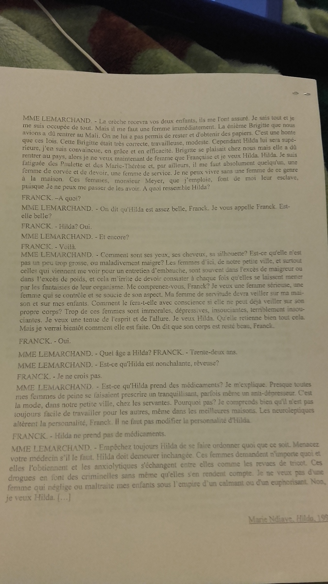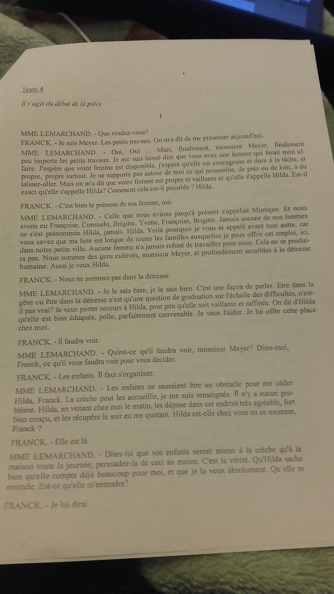 SelenaNina Posté(e) le 14 avril 2016 Signaler Posté(e) le 14 avril 2016 Salut j'ai besoin d'aide c urgent! J'e dois faire un écris d'invention à partir du texte mais le problème et que je ne comprend pas et que j'ai pas du tout d'inspiration. Donc est ce que l'on pourrait m'aider il me reste que 3 Jours pour le faire. Vous êtes metteur en scène et faite paraître votre note d'intention pour la scénographie et la mise en scène du texte de Marie Ndiaye. Vous veillerez à décrire vos choix et à les justifier à partir de votre lecture de la scène.