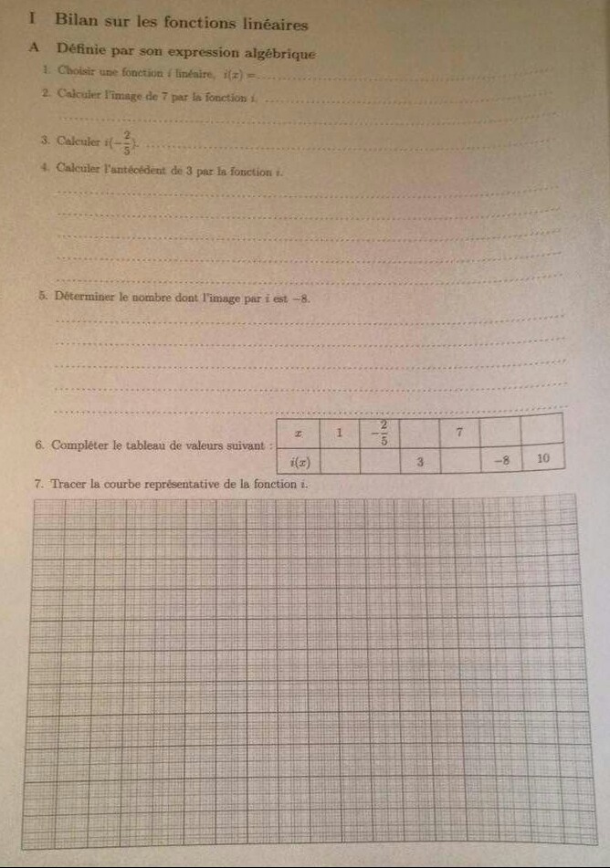 E-Bahut PAVE Posté(e) le 15 avril 2016 E-Bahut Signaler Posté(e) le 15 avril 2016 Bonsoir, 1) Sur ce site tu as un correcteur d'orthographe à ta disposition donc on ne devrait plus voir des messages comme le tien.... je narive pas de tou en math....qui peux m'aider svp Je n'arrive pas du tout en mathématique... qui peut m'aider S.V.P. 2) C'est quoi une classe "autre" ? difficile de t'aider efficacement si l'on ne connait pas ton niveau... 3) Fonction linéaire : * dans ton cours comment une fonction linéaire est-elle DÉFINIE ? Définition ?? * quels exemples t'a-t-on donnés ? Je te donne un exemple simple ultra classique : A la pompe à essence, il y a 3 compteurs. L'un qui change rarement de valeur, donne le prix du litre d'essence : par exemple 1,25 €/L. Les deux autres tournent lorsque l'on met de l'essence dans le réservoir. Au départ ils indiquent tous les deux la valeur 0 : normal quand le volume versé dans le réservoir vaut 0 Litres, le prix à payer est 0 €. Mais dès que l'on verse de l'essence, l'indicateur de VOLUME change de valeur et le prix à payer... change aussi. Le prix à payer dépend du volume versé ; on dit que le prix est FONCTION du volume acheté. Il est évident que plus on prend d'essence, plus la somme à payer est grande. Quelle est la relation entre ces 2 grandeurs : le volume x (en Litres) et le prix à payer y . Ces 2 grandeurs sont proportionnelles donc y/x = constante qui ici est prix au litre soit 1,25 €/L Si le volume acheté est x, le prix à payer est y = 1,25 x La relation f qui au volume x fait correspondre le prix à payer f(x) est une FONCTION LINÉAIRE. Généralisation : Toute FONCTION f qui à un nombre variable x fait correspondre un nombre noté f(x) tel que f(x) = a x (est un nombre constant appelé coefficient directeur ou plus souvent coefficient de proportionnalité) est une fonction LINÉAIRE de coefficient constant a. Pour en revenir à ta fiche de révision, pour avoir une fonction linéiare il suffit de choisir un nombre a. Fais ton choix... et essaye de répondre aux questions suivantes.