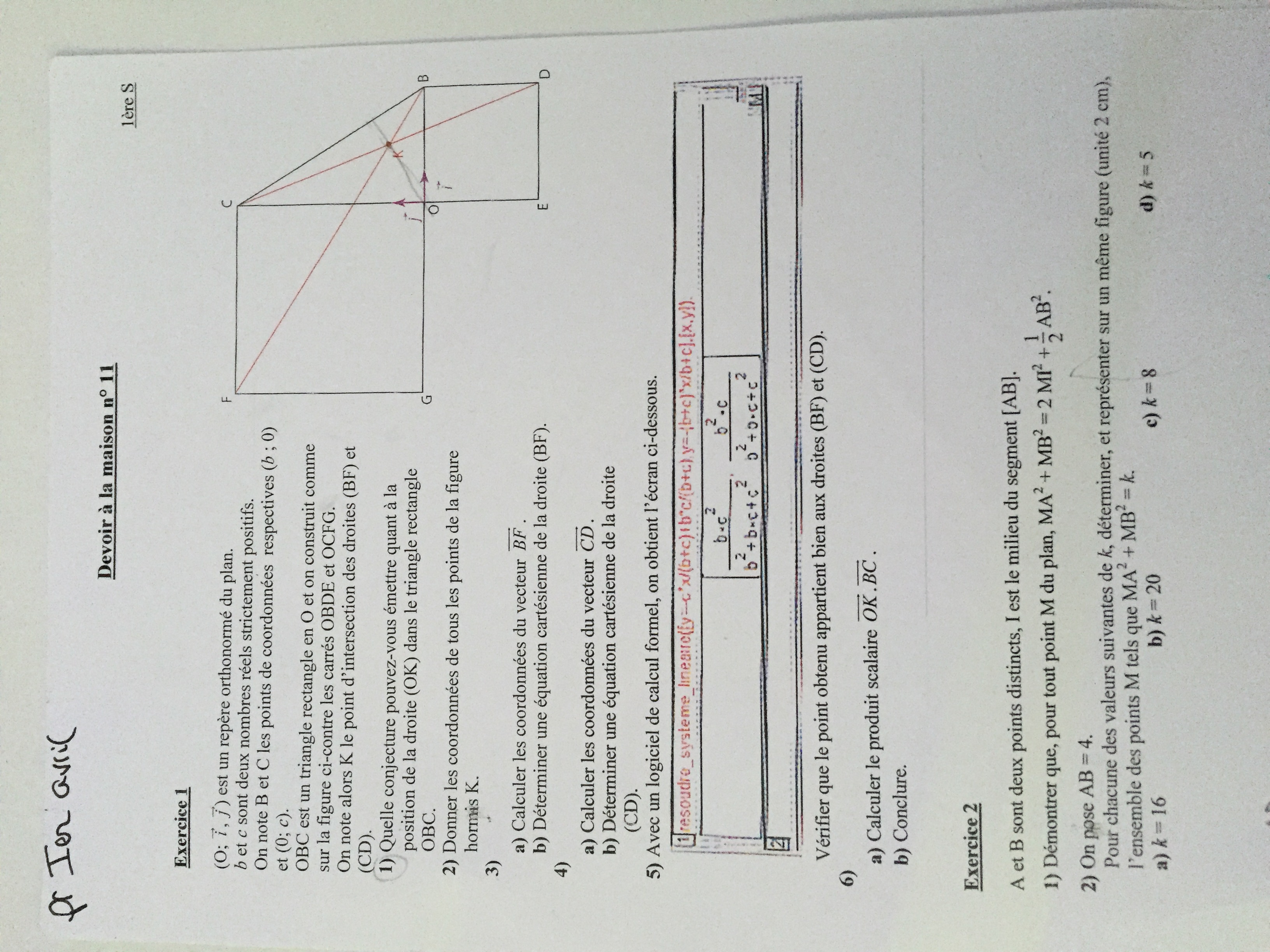 E-Bahut PAVE Posté(e) le 20 avril 2016 E-Bahut Signaler Posté(e) le 20 avril 2016 Je vais aller.... dormir Dans la question 5 dans le tableau du calcul formel, tu as les équations des 2 droites sous forme réduite (y = mx +p) Perso je sais que si X et Y sont les coordonnées d'un vecteur directeur de la droite, le coef directeur de cette droite est m = Y/X (on dit parfois variation de y sur variation de x, ce qui est pratique sur un graphique...) J'ai oublié le passage des coordonnées d'un vecteur directeur à la forme ax+by +c = 0 de la droite correspondante mais peu importe car avec ce signe - qui se promène, ce n'est pas facile à mémoriser... à mon âge Mais pour déterminer soit p (l'ordonnée à l'origine de la forme y = mx+p) soit c de la forme (ax+by+c = 0), il FAUT connaitre en plus du vecteur directeur (qui donne la direction des droites toutes parallèles) un POINT de la droite. Les coordonnées de ce point vérifient l'équation de la droite... Bonne nuit !!