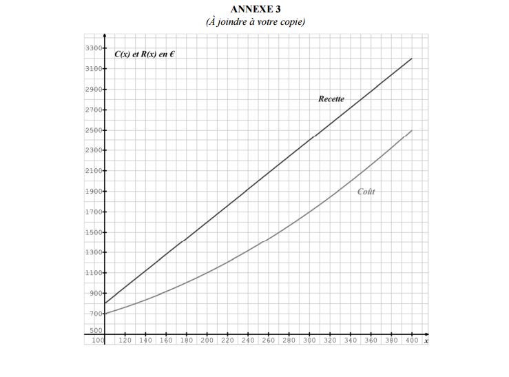 Zacharuk Fifi Posté(e) le 21 avril 2016 Auteur Signaler Posté(e) le 21 avril 2016 oui je comprend, j'ai donc essayée de faire ce devoir Etude du coût: 1. j'ai réussi à remplis l'annexe 1 : x : 100 140 180 200 240 280 300 340 360 380 400C(x): 700 836 1 004 1 100 1316 1 564 1 700 1996 2156 2324 2 500 2. D'après les valeurs du tableau nous pouvons dire que la variation du coût est croissante. 3. le nom de la courbe représentative du coût est......... ???? 4. Pour la suite je ne sais pas comment décomposer la fonction C en deux fonction f et g. f étant une fonction ax2 et g un fonction affine.et donc je ne peux pas remplir l'annexe 2. Etude du bénéfice : Il envisage de vendre le ticket à 8€ 6. pour calculer la recette pour 100, 200, 300, 400 tickets vendus par jour j'ai essayé se calcul mais je suis sur que c'est pas le bon. - 8 * 100 = 800 - 8 * 200 = 1600 - 8 * 300 = 2 400 - 8 * 400 = 3 200 7. Pareil pour cette exercice j'ai essayer pleins de calculs et celui ma semblait le plus correct Bénéfice pour 100 clients: R(800) - C(700) = B(100) " " pour 200 clients: R(1 600) - C(1 100) = B(500) " " pour 400 clients : R(3 200) - C(2 500) = B(700) 8.Pour cette questions j'ai du mal à comprendre ce que je dois faire, si je dois refaire les même calculs que la Q7 en changeant le coût par le x ? ou autres chose ? Pour commencer j'aimerais que vous m'aidiez à comprendre et à me corriger si nécessaire pour cette partie là s'il vous plaît.