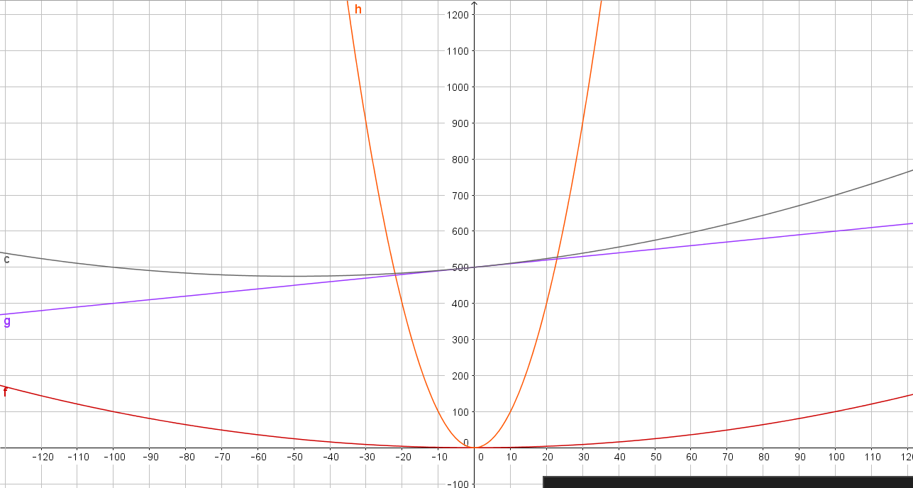 Zacharuk Fifi Posté(e) le 21 avril 2016 Signaler Posté(e) le 21 avril 2016 Bonjour, cela fait plusieurs semaines que j'essaye de réalisé le sujet ci-dessous. Même avec l'aide de la leçon je n'y comprend rien... Les mathématiques ont toujours était mon point faible. Merci de votre compréhension Première Partie: Un forain met en place un nouvelle attraction. Il veut déterminer le montant du ticket pour cette attraction. Le coût journalier en fonction du nombre x de personnes qui utiliseront son attraction est donné par la relation ; C(x) = 0,01x2 + x + 500 pour un nombre prévisible d'utilisateurs compris entre 100 et 400. x représente le nombre de tickets ou le nombre de clients. Etudes du coût: 1. 1. En utilisant la calculette compléter le tableau de valeurs de l’annexe 1. 2. D’après les valeurs du tableau que peut-on dire de la variation du coût sur [100 ; 400] ? 3. Quel est le nom de la courbe représentative du coût ? 4. Décomposer la fonction C en deux fonctions f et g, f étant une fonction de la forme ax² et g une fonction affine. 5. Compléter le tableau de l’annexe 2 concernant les variations de C, f et g. La variation du coût déduite du tableau de valeurs du 2) est-elle confirmée ? Étude du bénéfice : Il envisage de vendre le ticket 8 €. 6. Calculer la recette pour 100 tickets, 200 tickets et 400 tickets vendus par jour. 7. En utilisant le tableau de valeurs du 2) et les résultats précédents, calculer le bénéfice pour 100, 200 et 400 clients.Rappel : Bénéfice = recette – coût soit B(x) = R(x) – C(x) 8. Exprimer la recette R en fonction du nombre x de tickets vendus par jour. Les courbes représentatives de la recette et du coût sont données en annexe 3. 9. Déterminer graphiquement le bénéfice pour 200 et 300 clients (laisser apparents les traits de construction). 10. Montrer que B(x) = –0,01x² + 7x – 500 puis vérifier les valeurs des bénéfices calculés à la question 7 en utilisant l’expression de B(x). 11. Déterminer l’extremum de la fonction B(x), puis dresser le tableau de variation de B(x) sur [100 ; 400]. 12. Pour combien de clients journaliers aura-t-on un bénéfice maximum ? Quel sera ce bénéfice ? Deuxième partie: Le forain veut déterminer le coût unitaire, c'est-à-dire le coût pour un client. Le coût unitaire Cu se calcule en appliquant : Cu(x) = C (x) avec x ≠ 0 x 1. Montrer que : Cu(x) = 500 + 0,01x + 1 x 2. Calculer les coûts unitaires pour 100, 200 et 400 clients. Le coût unitaire peut être décomposé en deux fonctions f et g telles que : f(x) = 500 et g(x) = 0,01x + 1 x 3. Donner en justifiant la variation de la fonction f. Quel est le nom de sa courbe représentative ? 4. Donner en justifiant la variation de la fonction g. Quel est le nom de sa courbe représentative ? 5. D’après les variations de f et g, donner si possible la variation du coût unitaire. Justifier. La courbe représentative du coût unitaire est donnée en annexe 4 sur [100 ; 400]. 6. Déterminer graphiquement le nombre de clients en arrondissant à la dizaine la plus proche qui donne un coût unitaire inférieur à 6 €. Laisser apparents les traits de construction. 7. Déterminer graphiquement le nombre de clients pour lequel le coût unitaire est minimum. Quel est ce coût ? Pour déterminer algébriquement le nombre de clients pour lequel le coût est minimum on utilise la fonction dérivée qui sera vue en Terminale. La fonction dérivée du coût unitaire est la suivante : Cu’(x) = − 500 + 0,01 x2 Pour connaître l’extremum d’une fonction, on doit résoudre Cu’(x) = 0. 8. Résoudre Cu’(x) = 0 et vérifier la valeur trouvée au 7). 9. Conclure en expliquant pourquoi le choix d’un prix du ticket à 8 € est judicieux.