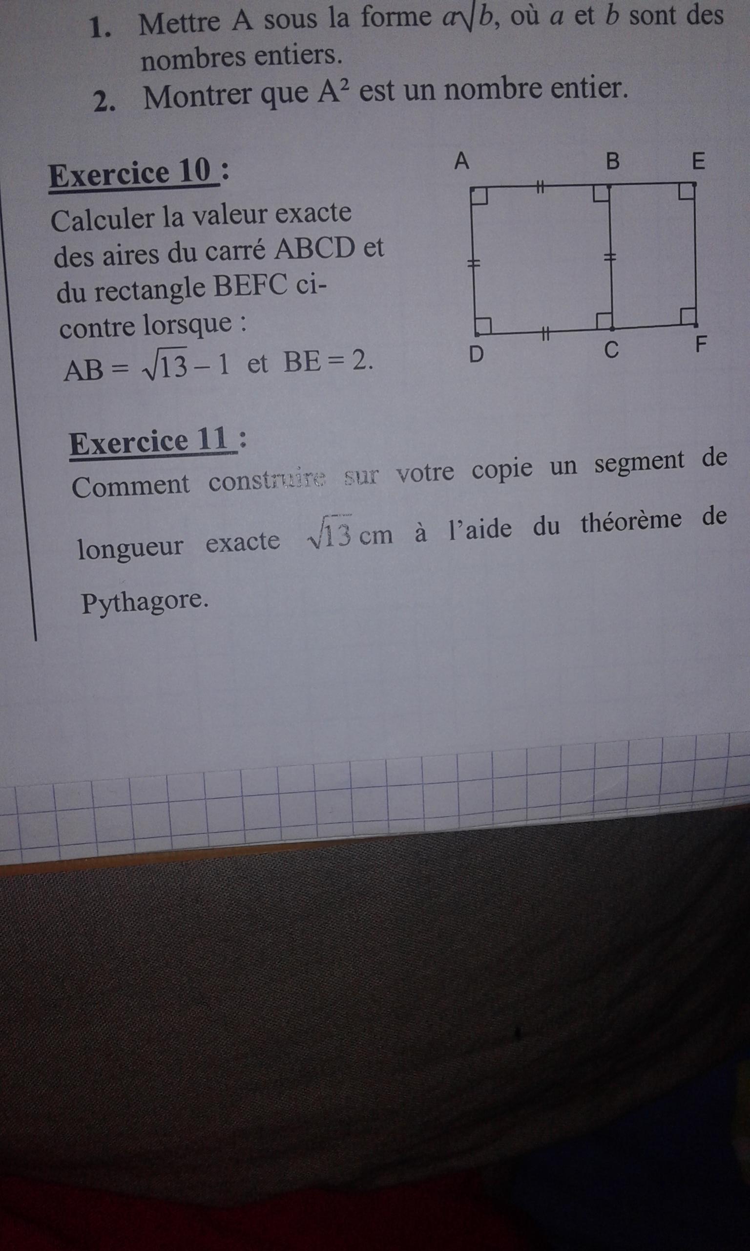 mimi.75 Posté(e) le 23 avril 2016 Signaler Posté(e) le 23 avril 2016 Bonjour , l'exercice 10 je n'arrive pas a le faire si vous pourriez m'aidez s'il vous plait. Je me suis dit que ces: racine carre de 13-1×racine carre de13-1/2. Mais je ne suis pas sur.