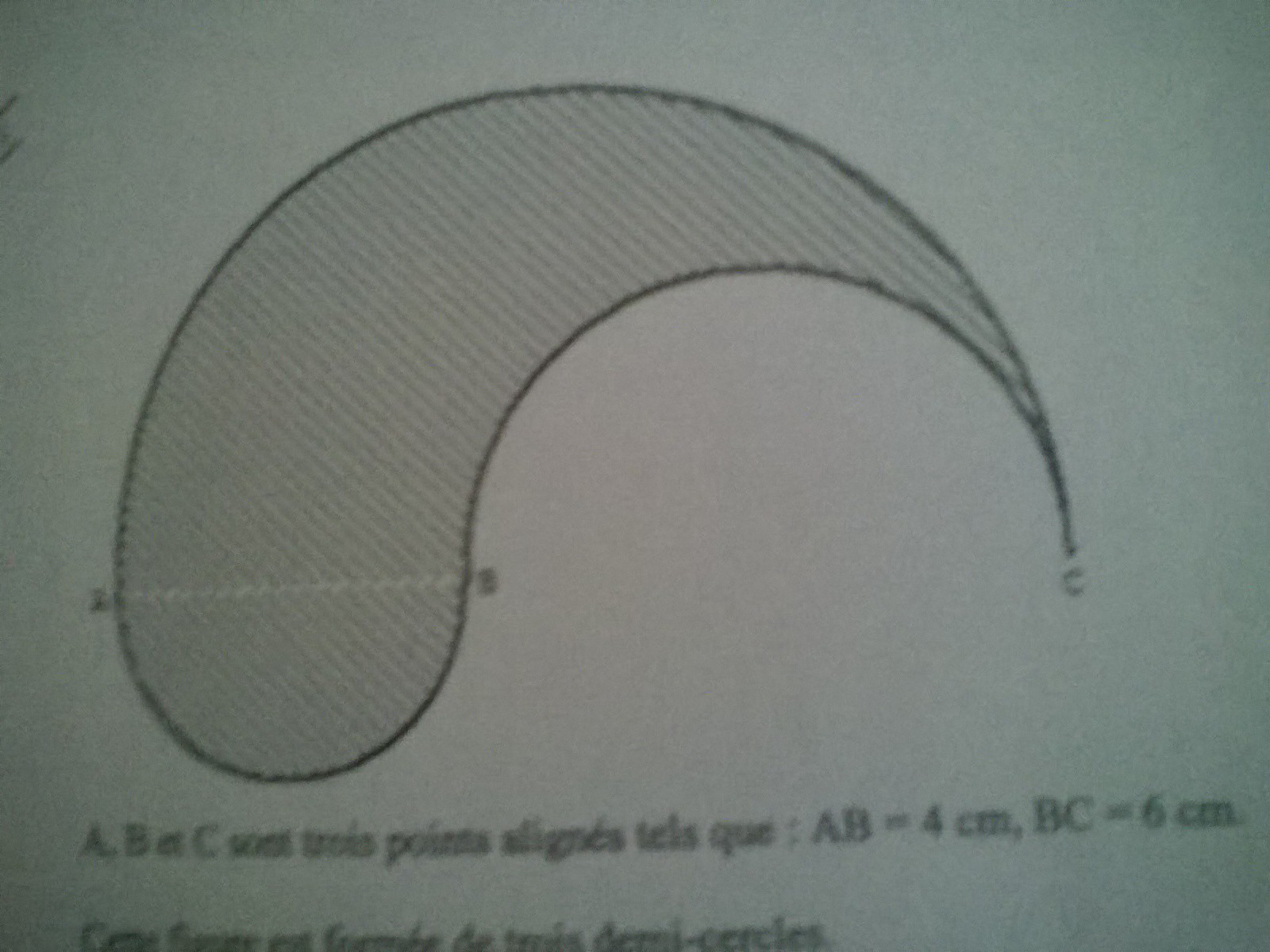debo3007 Posté(e) le 10 mai 2016 Signaler Posté(e) le 10 mai 2016 boujour j ai un dm de maths a faire sauf que je n ai rien compris pouvez m aider le plus vide car ce devoir est a rendre demain voicil exercice: A B C sont trois points alignés tels que :AB=4CM BC=6CM cette figure est formée de trois demi -cercles -calculer son périmètre -calculer son aire