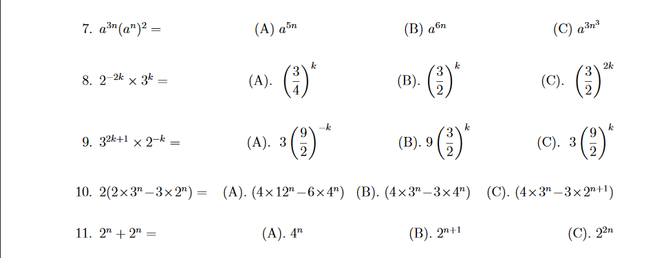 patmarechal Posté(e) le 15 août 2016 Signaler Posté(e) le 15 août 2016 Bonjour ! Pas vraiment pratique pour écrire des formules sur ce site, en effet ! Je vais te donner quelques indications, s'il y a quelque chose que tu ne comprends pas n'hésite pas à me le dire. Pour le 7, c'est une combinaison de somme et de produits d'exposants, tu as a3n (an)2 = a3n * a2*n = a3n+2*n, ce que tu peux normalement simplifier en suivant les règles de calcul relatives aux sommes et aux produits. Pour le 8, on commence par rappeler 2-k = 1/(2k). Une fois que tu as ça tu te trouves avec (1/2)2k * 3k, ce qui peut aussi s'écrire (1/4)k * 3k. Enfin tu simplifies pour trouver (3/4)k Pour le 9, c'est à peu près le même principe. Pour le 10, tu dois juste développer l'expression, et te rappeler que 2 = 21.