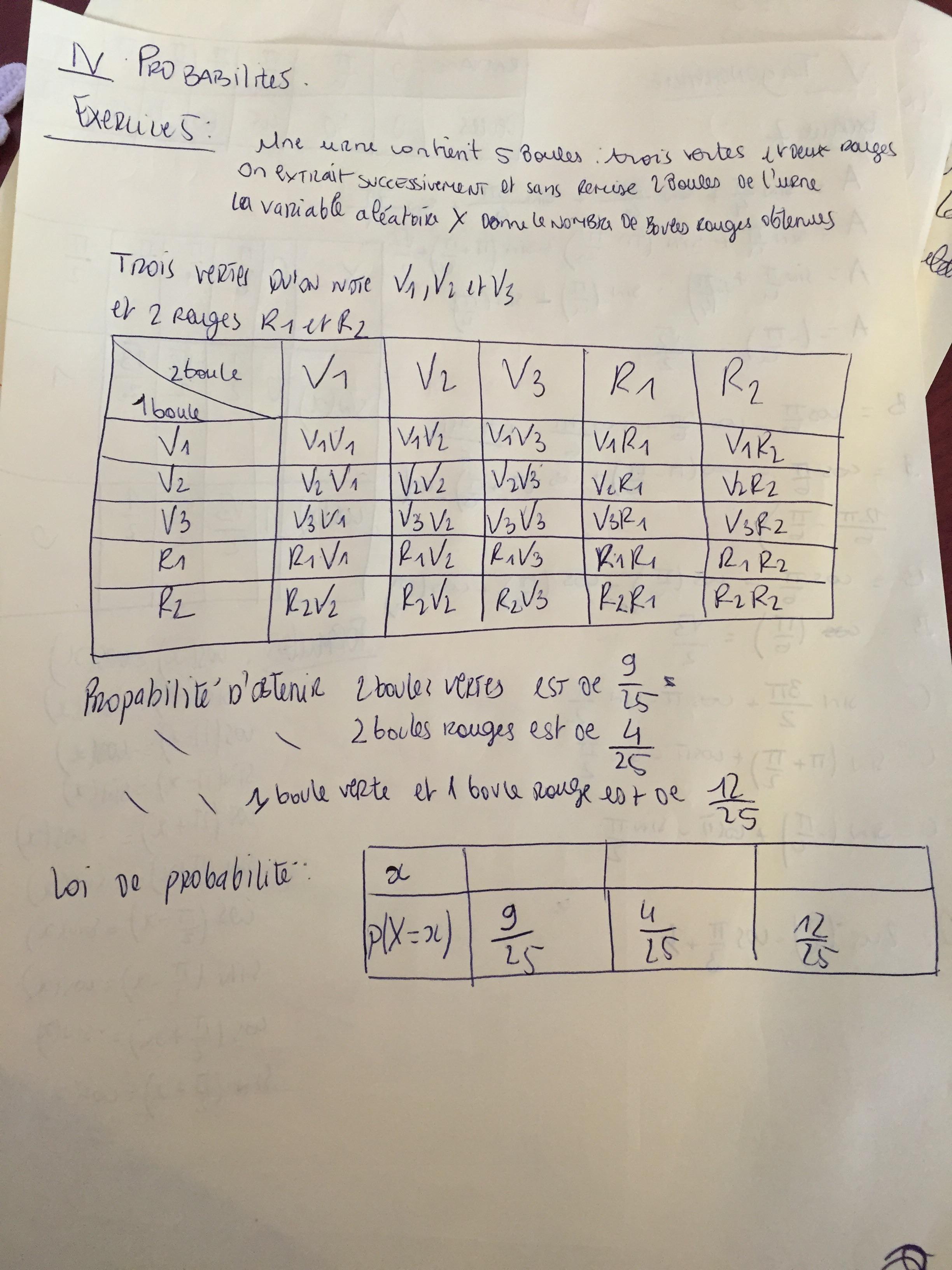 E-Bahut Barbidoux Posté(e) le 22 août 2016 E-Bahut Signaler Posté(e) le 22 août 2016 voir arbre Xi issue ==> Xi={0,1,2} P(X)={3/10,6/10,1/10} E(X)=somme des Xi*P(Xi)= 0*(3/10)+1*(6/10)+2*1/10)=0.8