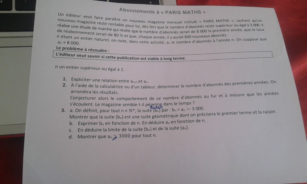 lolitamath Posté(e) le 21 septembre 2016 Signaler Posté(e) le 21 septembre 2016 Bonjour , j'ai un dm à faire pour demain et je voudrais de l'aide pour la dernière question mise à part cela j'ai tous fait , en faite , je ne suis pas sûr de mon résultat je le trouve bizarre . Merci d'avance Voici ce que j'ai essayer de faire an+1=5000*0,8^n+1-1+3000 an+1-an=5000*0,8^n+3000 -( 5000*0,8^n-1+3000 ) = 5000*0,8^n-5000*0,8^n-1 = 5000(0,8^n-0,8^n-1)