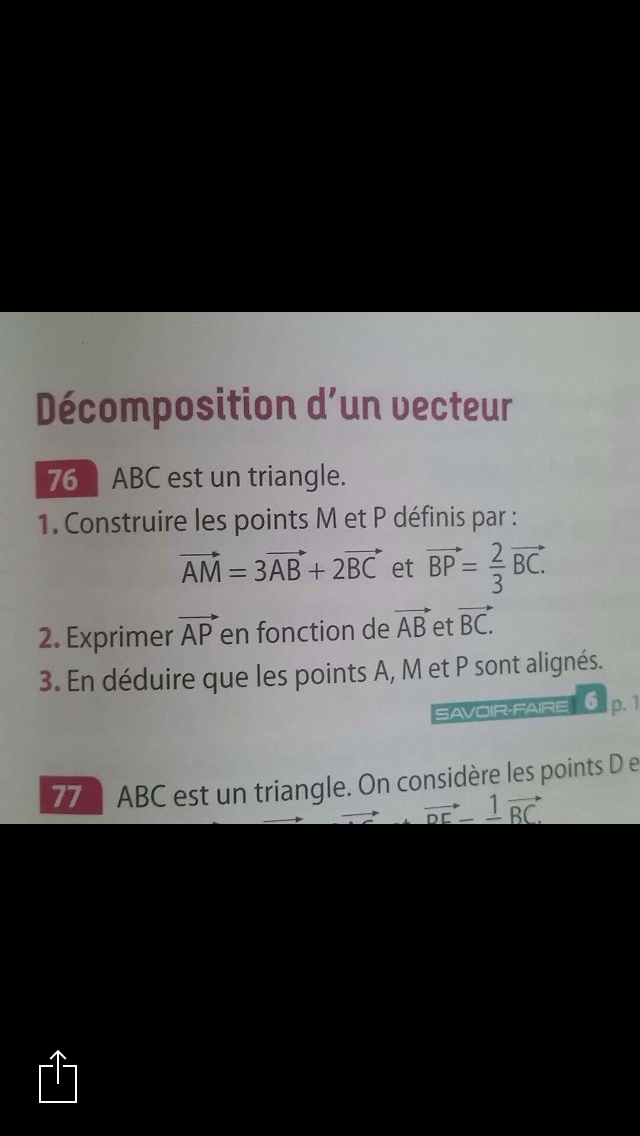 volcano47 Posté(e) le 2 octobre 2016 Signaler Posté(e) le 2 octobre 2016 à partir de AP = AB +2BC/3 (éviter d'écrire 2/3BC ! on ne divise pas par un vecteur), on exprime AB à partir de AM et BC (première relation) et ça s'arrange en deux lignes. Effectivement AP =k AM (tu trouves k sans problème) montre la colinearité.