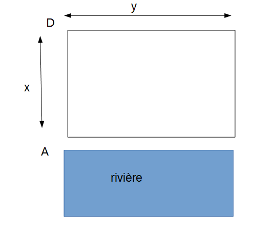 clemclem123456789 Posté(e) le 9 octobre 2016 Signaler Posté(e) le 9 octobre 2016 Bonjours j'aimerais un petit coup de pouce. L’énoncé: On veux clôturer sur trois cotés un champ rectangulaire . le quatrième coté est bordé par une rivière. On dispose d'une clôture longue de 400m. Soient x et y les dimensions du champ (x appartient à [0;200] et y appartient à [0;200] ) 1)Exprimer y en fonction de x donc a cette question je pense que la réponse est 2xaucarré-y 2) Démontrer que l'aire de champ est A(x)=400x-2x au carré donc la j'ai eu l'idée de réaliser une équation avec x fois y=400x-2x au carré mais je n'est pas eu de résulta c'est pour cela que je vous demande de l'aide.