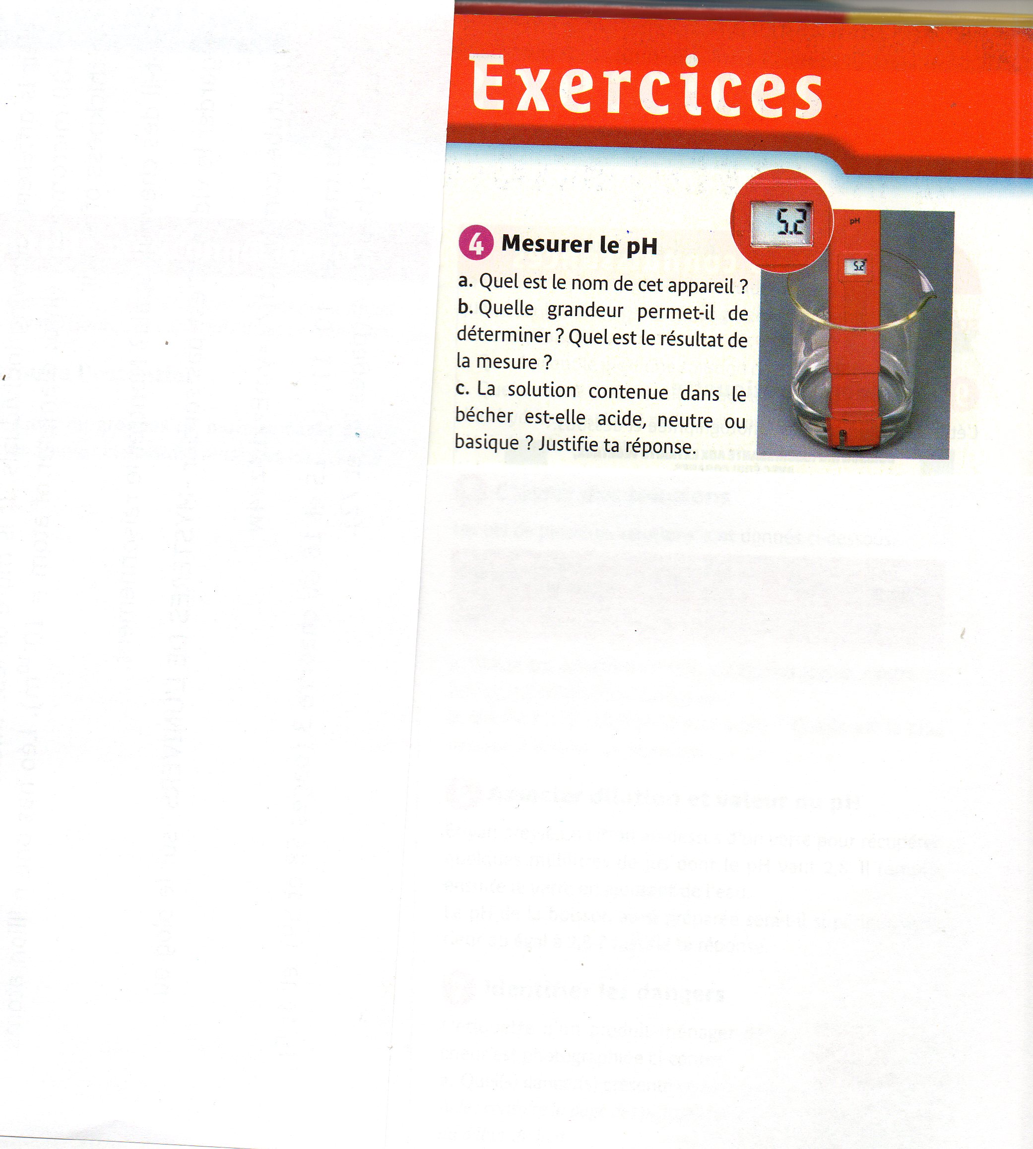 francoise 63 Posté(e) le 14 octobre 2016 Signaler Posté(e) le 14 octobre 2016 bonjour, pouvez vous me dire si mes exercices sont correct merci, d'avance Exercice N1 Mesurer le PH( pièce jointe pour la photo) A)Quel est le nom de cette appareille ? B) Quelle grandeur permet-il de déterminer? Quelle est le résultat de la mesure? A) L'appareil en question est un pH-mètre. b)Il permet de déterminer l'acidité d'un liquide. Le résultat est de 5.2. c)La solution mesuré est acide. En effet, la donnée obtenue est infèrieur a 7, qui est la limite entre acide et neutre. Inférieur à 7, le liquide est acide, égal à 7, elle est neutre et supérieur à 7, elle est basique réponse . exercice N 2 Les PH de plusieurs solutions sont donnés si dessous solution acide sulfurique soude eau de mer salive eau distillée PH 2,1 11,5 8 6,9 7 A) classe ces solutions en trois catégories( acide, neutre ou basique).Explique ton classement ? B)Quelle est la solution la plus acide? Quelle est la plus basique? Justifie ta réponse? réponse a) Acide sulfurique; salive = acideEau distillé = neutreSoude et eau de mer = basique.On a classé comme dit plus haut en fonction de leurs valeurs (supérieur, égal ou inférieur à 7)b)La solution la plus acide est l'acide sulfurique car elle a le taux de pH inférieur à 7 le moins élevé.La solution la plus basique est le Soude car il a la valeur supérieur à 7 la plus élevé. exercice N 3 ph-mètre 3 PH-mètre 4 Les deux récipients A et B contenaient le même jus de fruits.On ajoute de l'eau dans l'un des deux.a. Dans quel récipient a-t-on ajouté de l'eau? Justifieb. Comment évoluerait le pH si on ajoutait encore de l'eau dans le jus de fruit déjà dilué? réponse A: pH=3B: pH=4Les deux récipients A et B contenaient le même jus de fruits.On ajoute de l'eau dans l'un des deux.a. Dans quel récipient a-t-on ajouté de l'eau? JustifieC'est dans le récipient B que l'on a ajouté de l'eau car le pH est plus élevé dans l'eaub. Comment évoluerait le pH si on ajoutait encore de l'eau dans le jus de fruit déjà dilué?Le Ph augmenterait encore, pouvant aller jusqu'à 7.