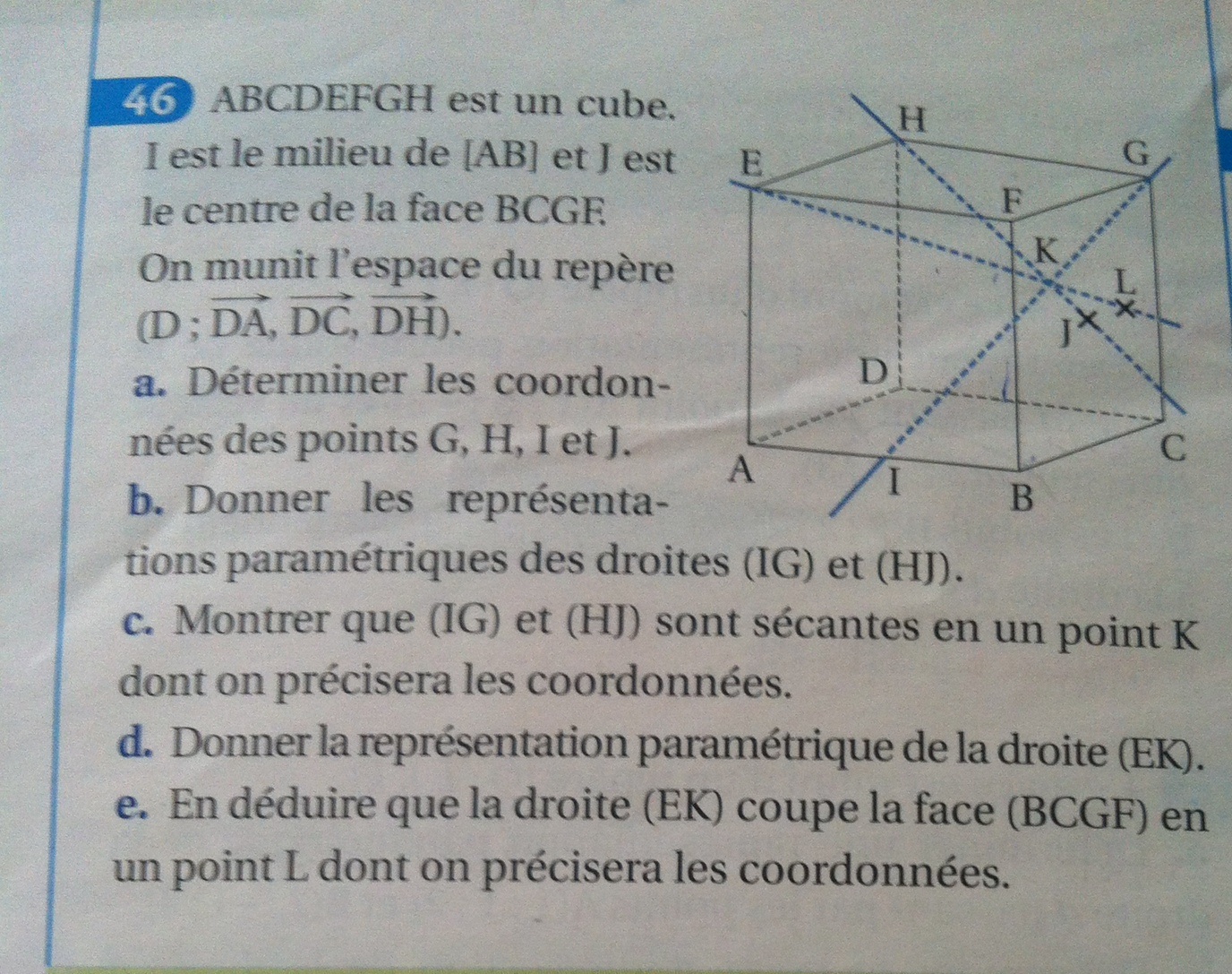 Sonia123 Posté(e) le 30 octobre 2016 Signaler Posté(e) le 30 octobre 2016 Bonjour vous pouvez me dire comment on fait juste la dernière question svpp Et je vous dit la réponse à la d car il fait ça pour faire la e donc EK est de représentation paramétrique x= 1-0,6t y=0,8t z=1-0,4t