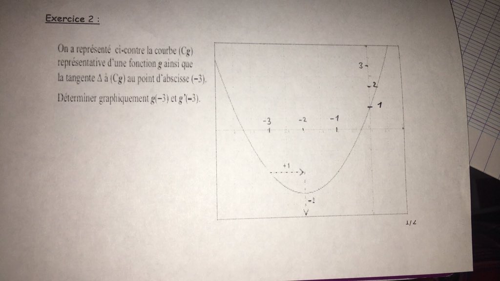 E-Bahut pzorba75 Posté(e) le 30 octobre 2016 E-Bahut Signaler Posté(e) le 30 octobre 2016 La tangente au point d'abscisse -3 à la courbe Cg n'est pas visible sur la pièce jointe, impossible de répondre aux questions.