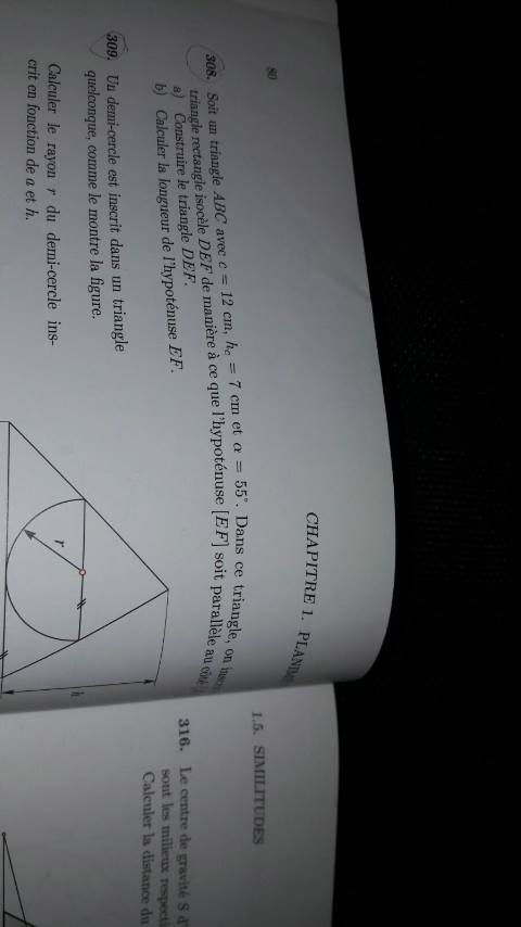 E-Bahut Barbidoux Posté(e) le 7 décembre 2016 E-Bahut Signaler Posté(e) le 7 décembre 2016 En supposant que hc alpha et c on les significations usuelles (hc hauteur issue de c, [AB]=c (côté opposé au sommet c, et alpha= angle au sommet A). Voici comment tracer le triangle inscrit. Le numéros indiquent l'ordre dans lequel on effectue le tracé. Ensuite Dans le Triangle ACM en appliquant Thalès on aura CE/CA=r/=6 et si l'on trace la hauteur de ce triangle qui intercepte EF on aura CE/CA=EO/AM=r/6=(h-r)/h=1-r/h et comme h=7 ==> r/6=1-r/7==> r=42/13
