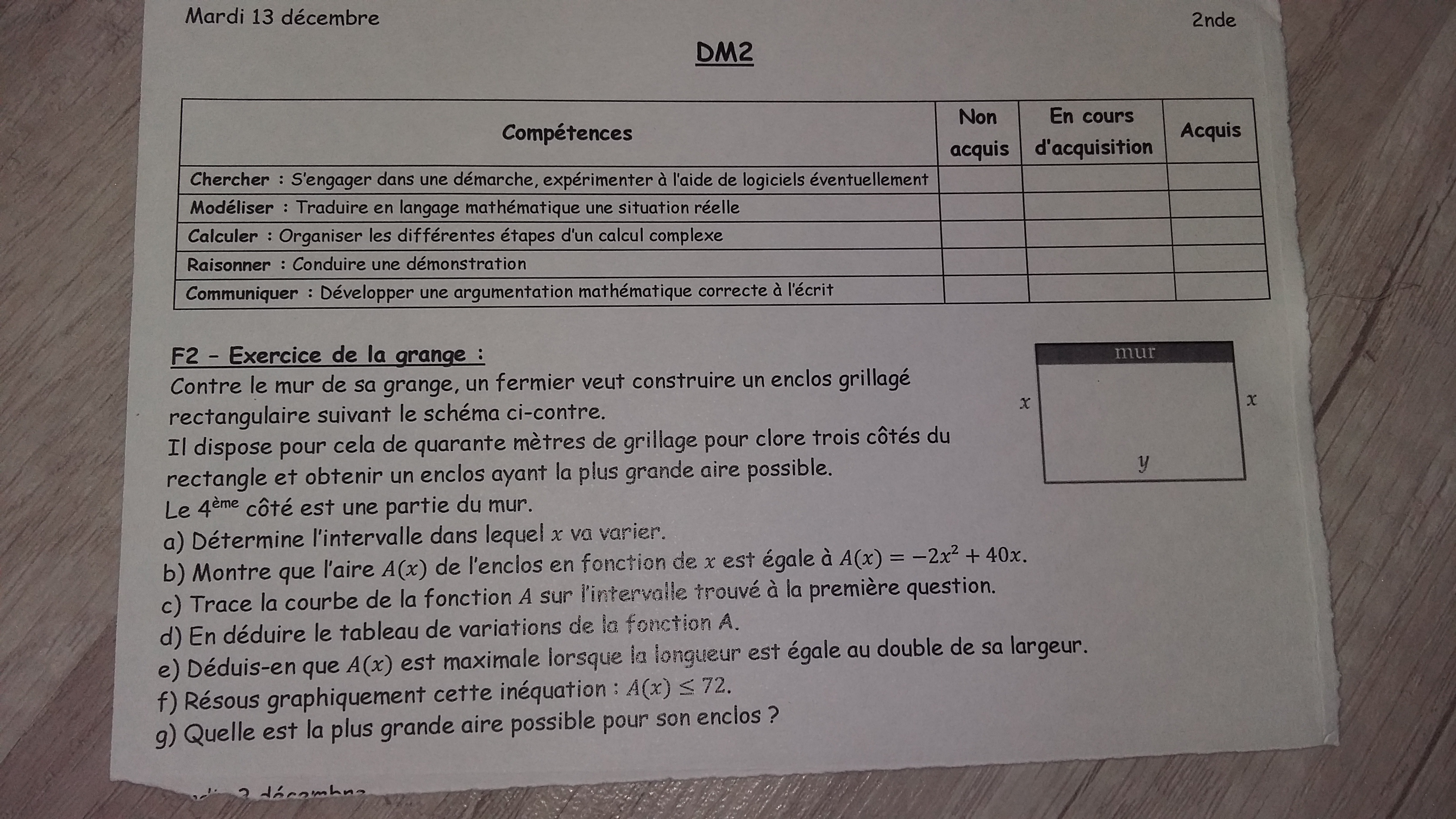 Hiphigenie Posté(e) le 14 décembre 2016 Signaler Posté(e) le 14 décembre 2016 Bonjour, a) La plus petite valeur de x est évidemment 0. La plus grande valeur de x est 20 (dans le cas où y=0) Donc x € [0 ; 20] b) On sait que l'aire de l'enclos est donnée par la formule : A(x) = x * y Or x + y + x = 40 2x + y = 40 ==> y = 40 - 2x Il suffit de remplacer y par 40-2x dans l'expression de A(x).