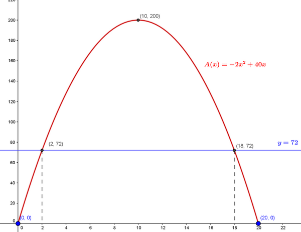 Hiphigenie Posté(e) le 14 décembre 2016 Signaler Posté(e) le 14 décembre 2016 Question f) Résoudre graphiquement l'inéquation A(x) ≤ 72 revient à chercher les nombres réels x qui ont une image par A inférieure ou égale à 72 Il faut donc chercher les points de la courbe représentative de la fonction A qui ont une ordonnée inférieure ou égale à 72, c'est à dire les points de la courbe représentative de la fonction A qui sont en-dessous de la droite d'équation y = 72, les solutions sont alors les abscisses de ces points. Il faut donc commencer par représenter la droite horizontale d'équation y = 72.
