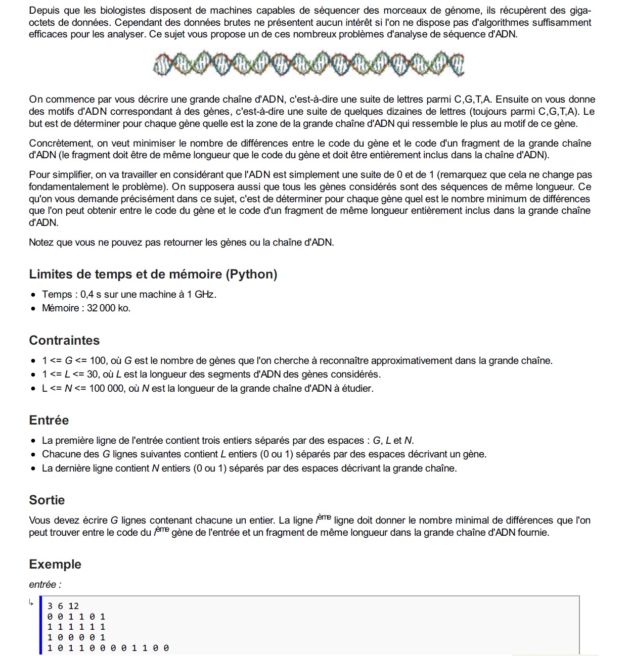 Tayot Loika Posté(e) le 29 décembre 2016 Signaler Posté(e) le 29 décembre 2016 Bonsoir, j'ai besoin d'aide pour ce problème s'il vous plait. Merci d'avance. On commence par vous décrire une grande chaîne d'ADN, c'est-à-dire une suite de lettres parmi C,G,T,A. Ensuite on vous donne des motifs d'ADN correspondant à des gènes, c'est-à-dire une suite de quelques dizaines de lettres (toujours parmi C,G,T,A). Le but est de déterminer pour chaque gène quelle est la zone de la grande chaîne d'ADN qui ressemble le plus au motif de ce gène. Concrètement, on veut minimiser le nombre de différences entre le code du gène et le code d'un fragment de la grande chaîne d'ADN (le fragment doit être de même longueur que le code du gène et doit être entièrement inclus dans la chaîne d'ADN). Pour simplifier, on va travailler en considérant que l'ADN est simplement une suite de 0 et de 1 (remarquez que cela ne change pas fondamentalement le problème). On supposera aussi que tous les gènes considérés sont des séquences de même longueur. Ce qu'on vous demande précisément dans ce sujet, c'est de déterminer pour chaque gène quel est le nombre minimum de différences que l'on peut obtenir entre le code du gène et le code d'un fragment de même longueur entièrement inclus dans la grande chaîne d'ADN. Notez que vous ne pouvez pas retourner les gènes ou la chaîne d'ADN. Limites de temps et de mémoire (Python) Temps : 0,4 s sur une machine à 1 GHz. Mémoire : 32 000 ko. Contraintes 1 G 100, où G est le nombre de gènes que l'on cherche à reconnaître approximativement dans la grande chaîne. 1 L 30, où L est la longueur des segments d'ADN des gènes considérés. L N 100 000, où N est la longueur de la grande chaîne d'ADN à étudier. Entrée La première ligne de l'entrée contient trois entiers séparés par des espaces : G, L et N. Chacune des G lignes suivantes contient L entiers (0 ou 1) séparés par des espaces décrivant un gène. La dernière ligne contient N entiers (0 ou 1) séparés par des espaces décrivant la grande chaîne. Sortie Vous devez écrire G lignes contenant chacune un entier. La ligne ième ligne doit donner le nombre minimal de différences que l'on peut trouver entre le code du ième gène de l'entrée et un fragment de même longueur dans la grande chaîne d'ADN fournie. Exemple Entrée 3 6 12 0 0 1 1 0 1 1 1 1 1 1 1 1 0 0 0 0 1 1 0 1 1 0 0 0 0 1 1 0 0 Sortie 1 3 0 Commentaires Premier motif : 1 différence au moins 1 0 1 1 0 0 0 0 1 1 0 0 0 0 1 1 0 1 Second motif : 3 différences au moins 1 0 1 1 0 0 0 0 1 1 0 0 1 1 1 1 1 1 Troisième motif : 0 différence est possible 1 0 1 1 0 0 0 0 1 1 0 0 1 0 0 0 0 1