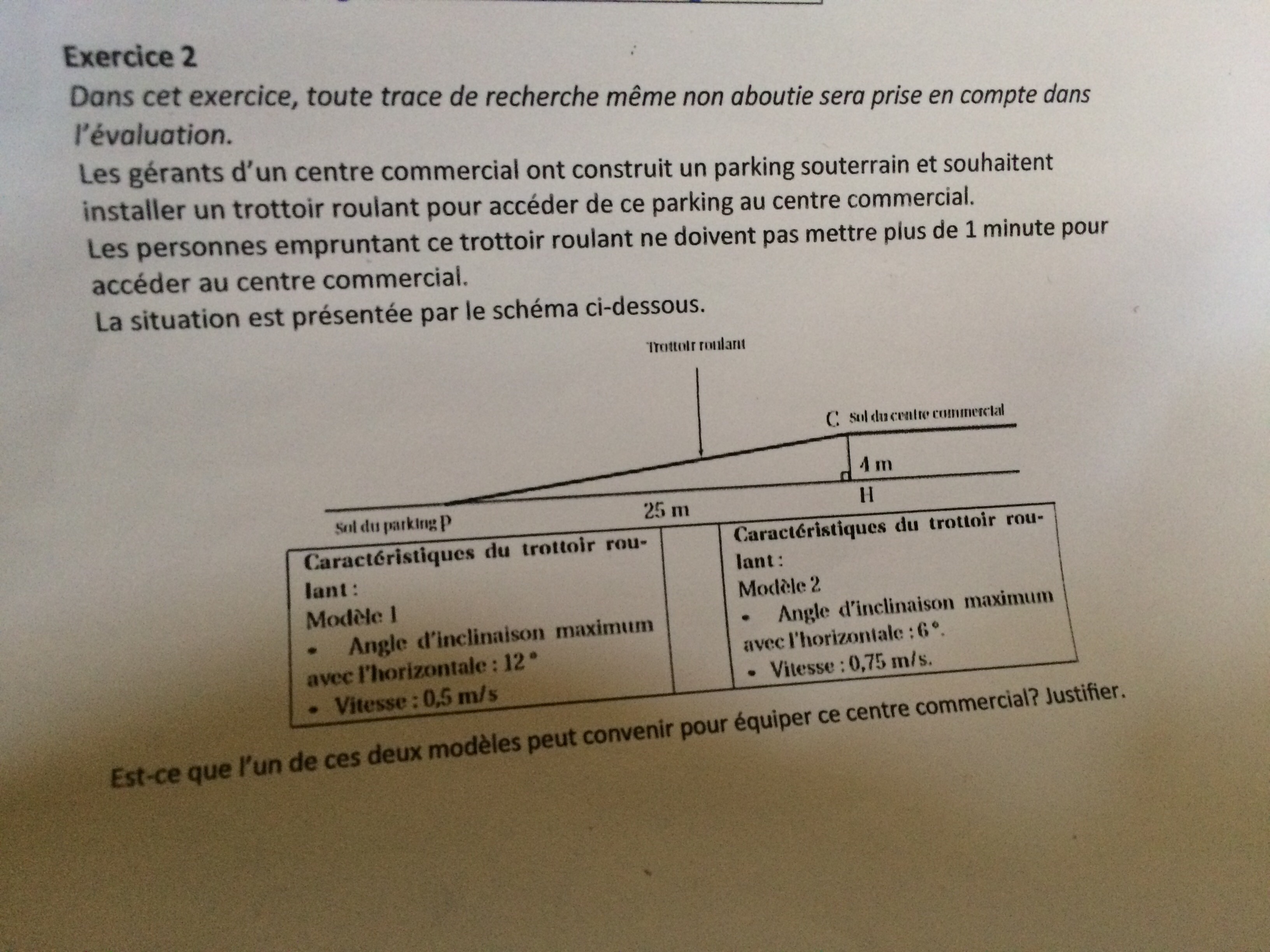 volcano47 Posté(e) le 8 janvier 2017 Signaler Posté(e) le 8 janvier 2017 d = v t (si on court à 10m/s, ce qui n'est pas mon cas, on court le 100m en 10 s) ici, d = distance PC et t =1 min exigé par le magasin PC dépend de l'angle a (a = 6 ou 10 ° ) puisque la hauteur CH est fixe (forcément) Reste à connaître la relation entre PC et l'angle a ; mais cet énoncé est très mal foutu puisque PH est également variable avec l'angle a ; on n' a pas toujours PH =25m ; donc je ne tiens pas compte de cette donnée. On a d sina = 4 et d =v t avec deux valeurs de v donc deux valeurs de d . Ou si on préfère a1 =12°, v1 = 0,5 m/s , sin a1 = 4/ d1 donne t1 = d1/v1 et mêmes relation avec l'autre angle et les valeurs v2 et d2. on compare t1 et t2 pour voir si un des deux est supérieur à 1 min , ce qui écarte la solution correspondante.