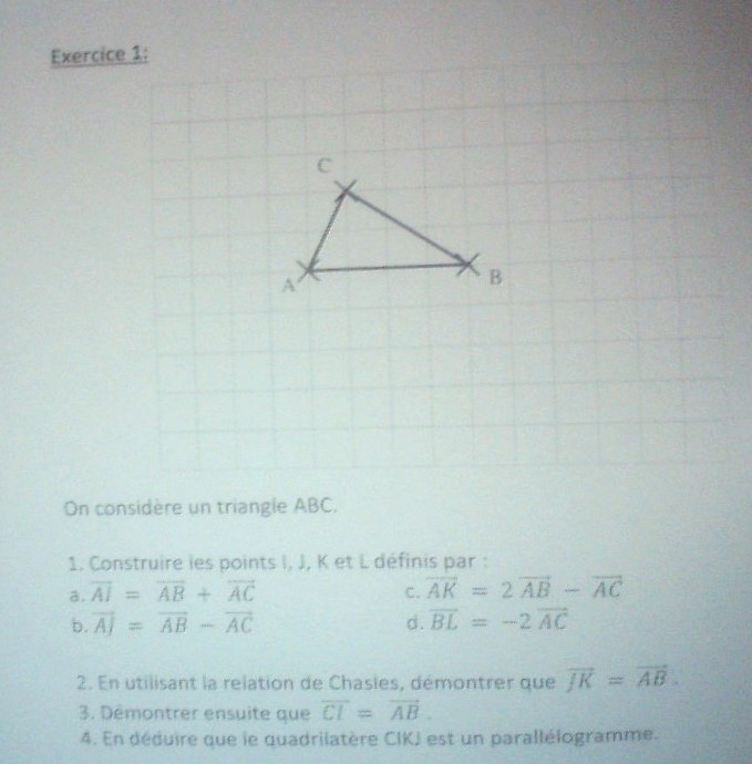 E-Bahut PAVE Posté(e) le 13 janvier 2017 E-Bahut Signaler Posté(e) le 13 janvier 2017 Bonsoir, Deux conseils : * un seul exercice par message * toujours accompagner l'énoncé, des traces de ton travail. Pour cela, il te suffit de reprendre ton cours, d'essayer de le comprendre, ensuite de l'apprendre et enfin d'essayer de l'appliquer. Je limiterai mon aide à ton premier exercice. 1 a) Construire le point I tel que : vect(AI) = vect(AB) + vect(AC)... c'est le COURS ! Revois comment on construit le vecteur somme de 2 autres (soit en construisant un parallélogramme, soit en construisant bout à bout les vecteurs AB et BI tel que vect(BI) = vect(AC) Tant que tu ne maîtriseras pas cette construction de base, construire les autres points est pour toi impossible. 2) Applique la relation de Chasles au vecteur JK en prenant comme 3ème point par exemple le point A. Là encore c'est la base du cours !! A toi d'essayer d'appliquer....