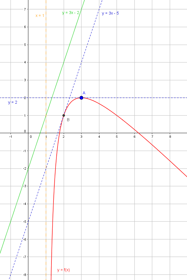 E-Bahut PAVE Posté(e) le 18 janvier 2017 E-Bahut Signaler Posté(e) le 18 janvier 2017 Bonjour, Il faut continuer.... Citation Voici ce que j'ai trouvé: -Passe par (3;2), donc f(3)=2 donc 3a+b+(c/2) = 2 -Admet une tangente horizontale en x=3, donc f '(3)=0 donc a-(c/4)=0 -Admet une tangente de coefficient directeur 3 en x=2 donc f '(2)=3 donc ?????