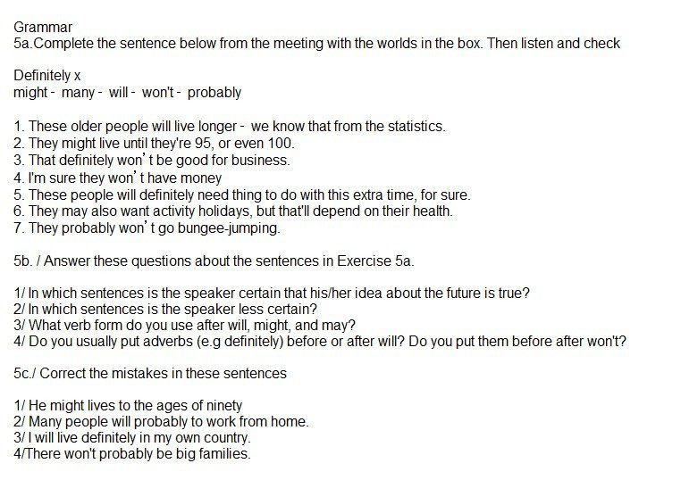 E-Bahut Jean B Posté(e) le 9 février 2017 E-Bahut Signaler Posté(e) le 9 février 2017 5b. Tu dois répondre aux 4 questions qui portent sur les phrases de l’exercice 5a. 1. Dans quelles phrases le locuteur est-il/elle certain(e) que son idée de l’avenir est vraie ? 2. Dans quelles phrases le locuteur est-il moins certain ? 3. Quelle forme verbale utilises-tu après will, might et may ? 4. D’habitude, tu places les adverbes (par exemple « definitely ») avant ou après will ? Est-ce que tu les places avant ou après won’t ? Il suffit de te reporter aux phrases du 5a. et de revoir éventuellement dans ta grammaire ou ton dictionnaire le sens et la fonction des mots : might – definitely – may – will – won’t – probably. 5c. Dans ces 4 phrases, il y a des fautes que tu dois corriger. Revois ta leçon, la place des adverbes, la forme verbale à employer après un modal. Quand tu auras répondu, je te corrigerai mais pas avant.