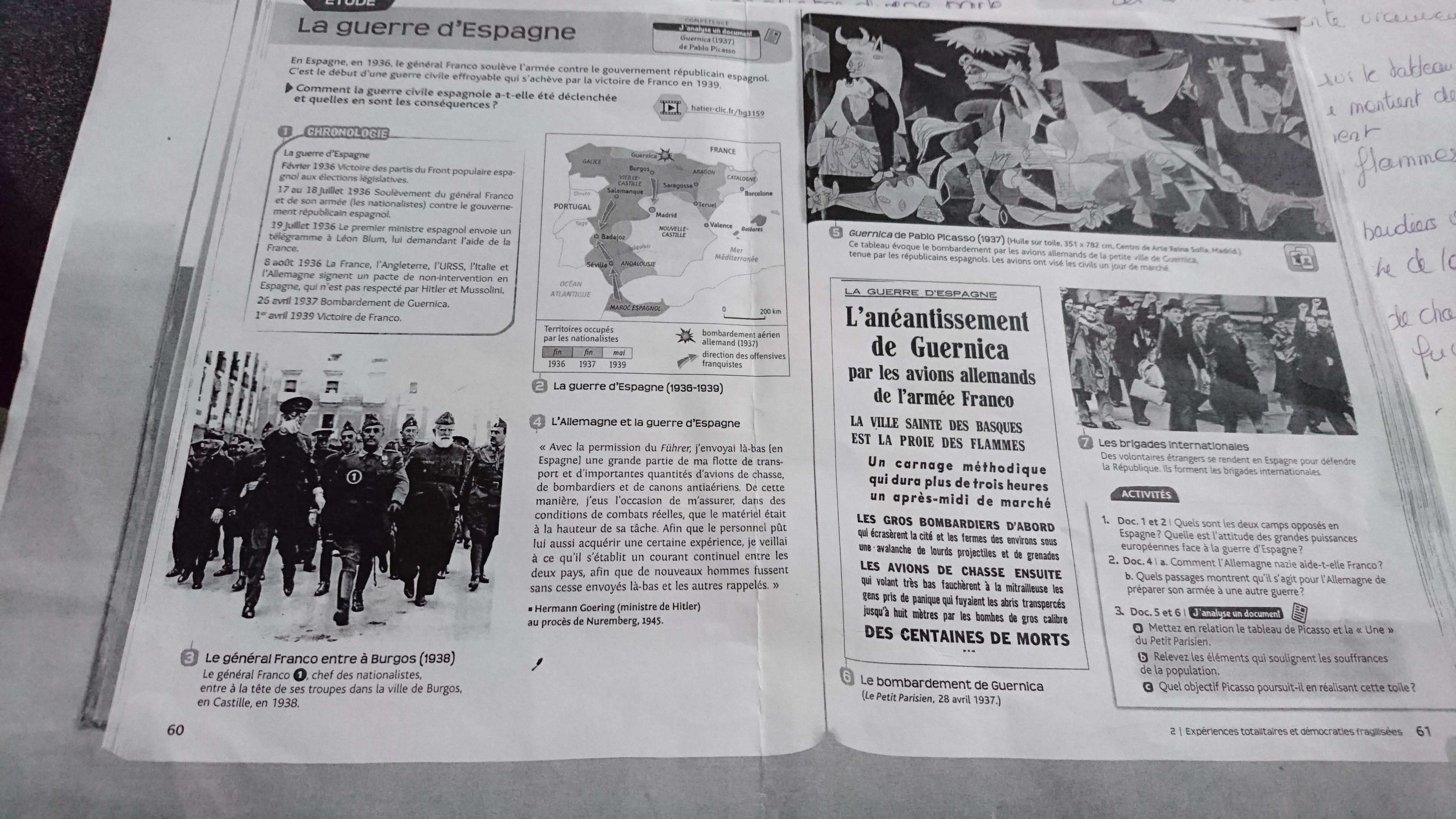 E-Bahut corcega Posté(e) le 12 février 2017 E-Bahut Signaler Posté(e) le 12 février 2017 Bonjour, 1ere question : Comment la guerre civile a-t-elle été déclenchée et quels en ont été les conséquences ? Voici un court résumé qui va t'aider à construire ta réponse. À toi de piocher et de rédiger des phrases personnelles. Une simple recherche sur Internet afin de te documenter aurait suffit. Résumé : La guerre d'Espagne (également désignée sous le nom de guerre civileespagnole[6]) est un conflit qui, du18 juillet 1936 au 1er avril 1939, opposa en Espagne, d'une part le camp desrépublicains, orienté à gauche et à l'extrême gauche, composé de loyalistes à l'égard du gouvernement légalement établi de la IIe République et de révolutionnaires anarchistes, et d'autre part les nationalistes, le camp des rebelles putschistes orienté à droite et à l'extrême droite mené par le général Franco. Cette guerre se termina par la victoire des nationalistes qui établirent une dictature qui dura 36 ans, jusqu'à latransition démocratique qui n'intervint qu'à la suite de la mort de Franco. Cette guerre civile fut la conséquence, sur le long terme, des malaises sociaux, économiques, culturels et politiques qui accablaient l'Espagne depuis plusieurs générations. Après la proclamation de laIIe République en 1931, l'exacerbation croissante des tensions entre Espagnols culmina avec l'insurrection durement réprimée des Asturies (1934) et la résurgence de troubles civils et de violences réciproques au printemps 1936, après la victoire électorale duFrente Popular. Préparé de longue date, le soulèvement militaire et civil du camp nationaliste éclata le 18 juillet 1936, mais sa mise en échec partielle déboucha sur une guerre civile imprévue, longue et meurtrière. Pendant le conflit, dans certains territoires sous contrôle républicain, unerévolution sociale aboutit à lacollectivisation des terres et des usines, et expérimente différentes sortes d'organisation de type socialiste(soutenues notamment par desanarchistes de la CNT[7]).