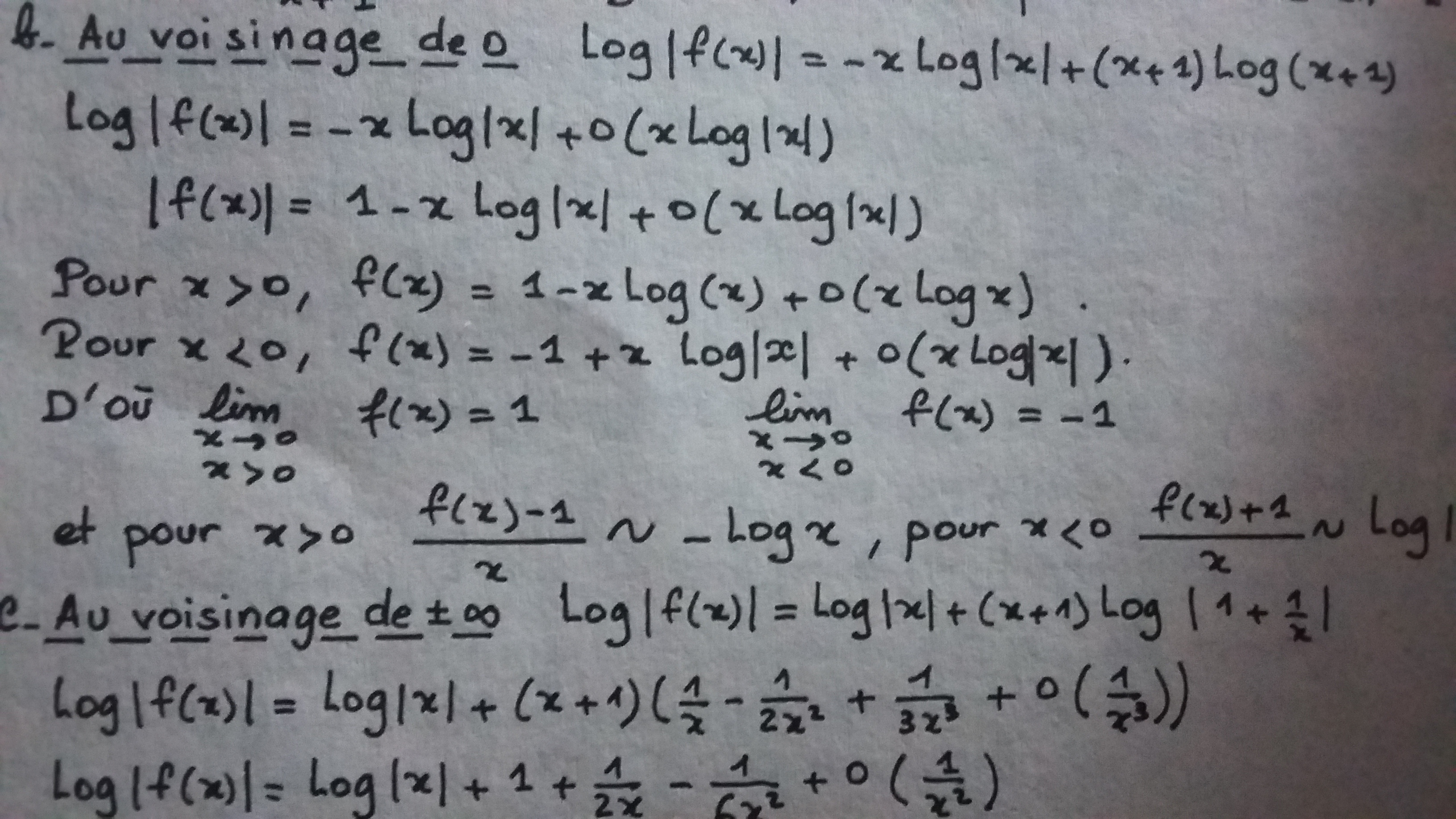 samynac Posté(e) le 25 février 2017 Signaler Posté(e) le 25 février 2017 étude de fonction f (x)=x |1+1/x|^(x+1) j'aime bien m'aider de justifier le passage première ligne vers deuxième ligne essentiellement le petit''o'' Merci d'avance ( photo prise d'un livre )
