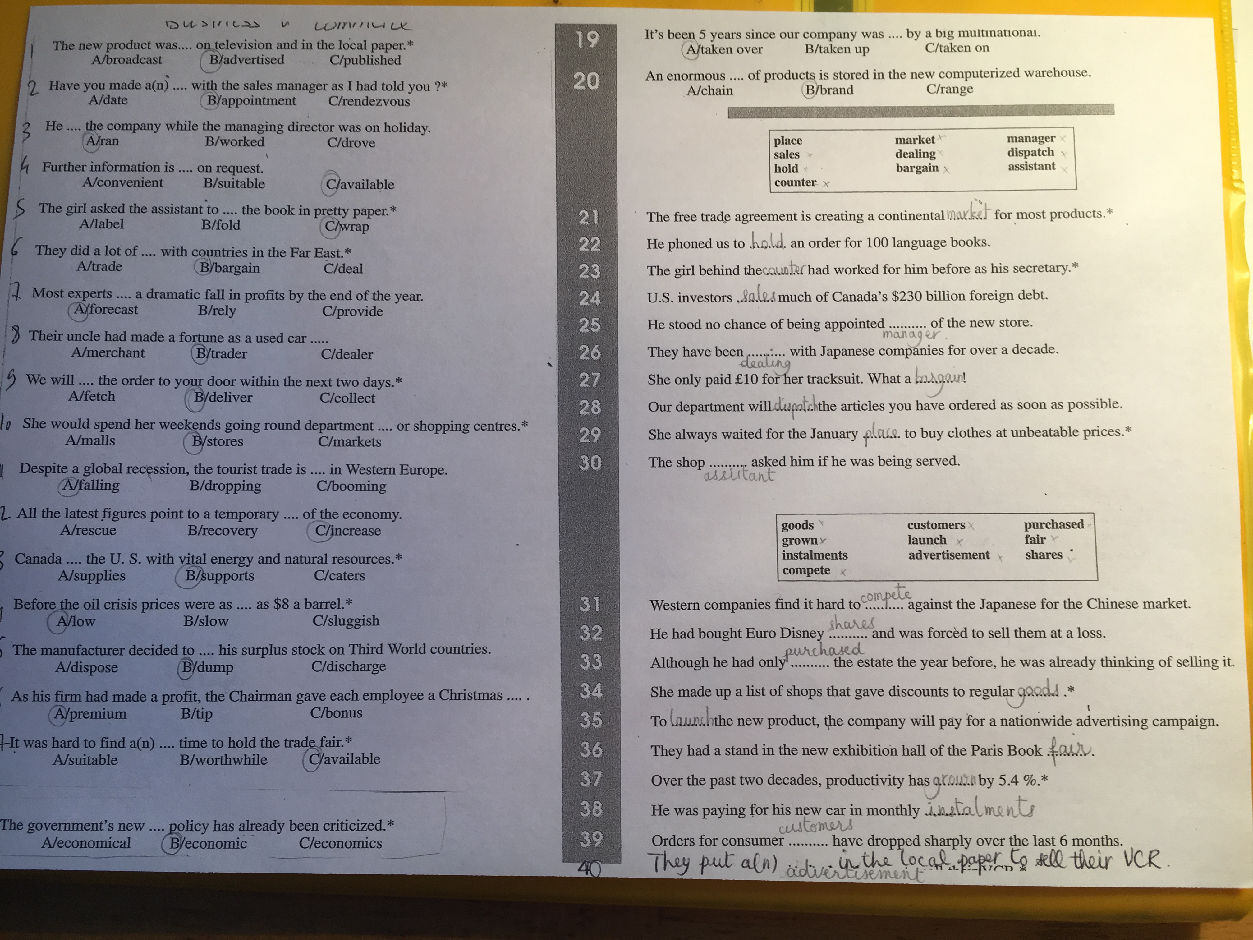 E-Bahut Jean B Posté(e) le 4 mars 2017 E-Bahut Signaler Posté(e) le 4 mars 2017 Bonsoir, À l'avenir s'il te plaît, pense au confort visuel de tes lecteurs ! Tu as une majorité de bonnes réponses sauf celles-ci : 6A, 8C,11C, 13A, 17C ou A, 20C, 22 place, 24 hold, 29 sales, 34 customers, 39 goods. J'ai du mal à saisir l'intérêt que peut présenter ce type d'exercice en classe de terminale car, pour la plupart des items, il suffit de faire appel au bon sens et/ou d'avoir recours au dictionnaire.