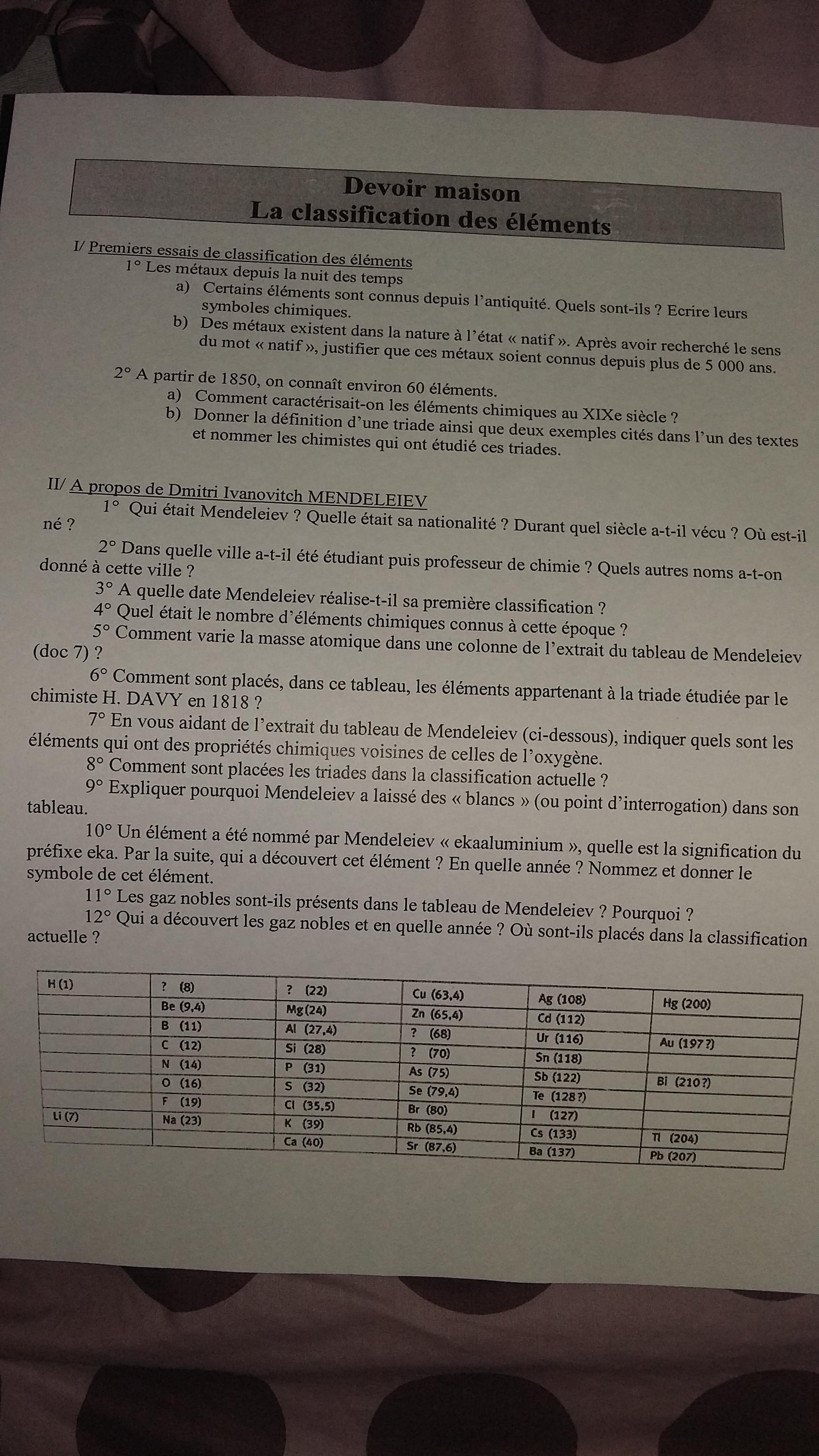 E-Bahut Boltzmann_Solver Posté(e) le 16 avril 2017 E-Bahut Signaler Posté(e) le 16 avril 2017 Bonsoir, Il manque des choses dans ton sujet. Passons. 1)b). Natif veut dire qu'on les trouve dans la nature. Ils sont connus depuis plus de 5000 ans car on peut les obtenir sans étape de préparation (réduction puis purification des métaux). 6) Ils sont placés en ligne (avant dernière) 8) Ils sont placés en colonne. 10) Eka signifie "qui suit". Donc, l'éka-aluminium est le gallium (je te laisse finir).