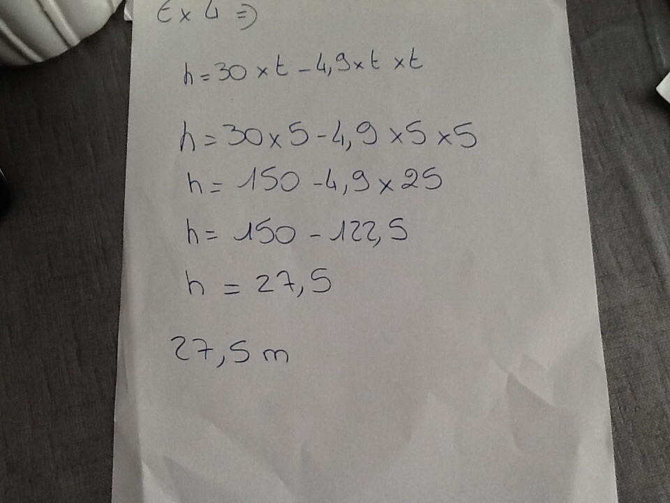 E-Bahut PAVE Posté(e) le 21 avril 2017 E-Bahut Signaler Posté(e) le 21 avril 2017 Le 18/04/2017 at 21:40, Kilyan a dit : Exercice 4 j'ai fait h=30x5-4,9x5x5 Ce n'est pas le tout de poser des calculs, il faut de plus... les effectuer. Puis répondre à la question posée par une phrase rédigée (sans oublier de donner l'unité).