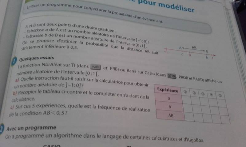 camille.trn Posté(e) le 23 avril 2017 Auteur Signaler Posté(e) le 23 avril 2017 il y a 6 minutes, Denis CAMUS a dit : Quelle TI est utilisée dans ton livre ? Car ni avec la TI collège, la ti 82 ou TI83+ je ne trouve l'instruction NbrAléat. Il y a rand., ou RandInt( sur la 83+. Moi j'ai la casio 35+