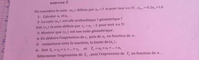 Ryan1212 Posté(e) le 30 avril 2017 Signaler Posté(e) le 30 avril 2017 Bonsoir, J'aurais besoin d'aide pour la suite mon devoir maison, je tente de résoudre les exercices avec de grandes difficultés. S2:3+6+12+....+3072 Comlent on calcule la somme d'une suite géométrique ? Pouvez-vous m'aider à faire la question 4-5-6 de l'exercice 2. J'ai commence pouvez-vous me corriger. Merci d' avance à tous!