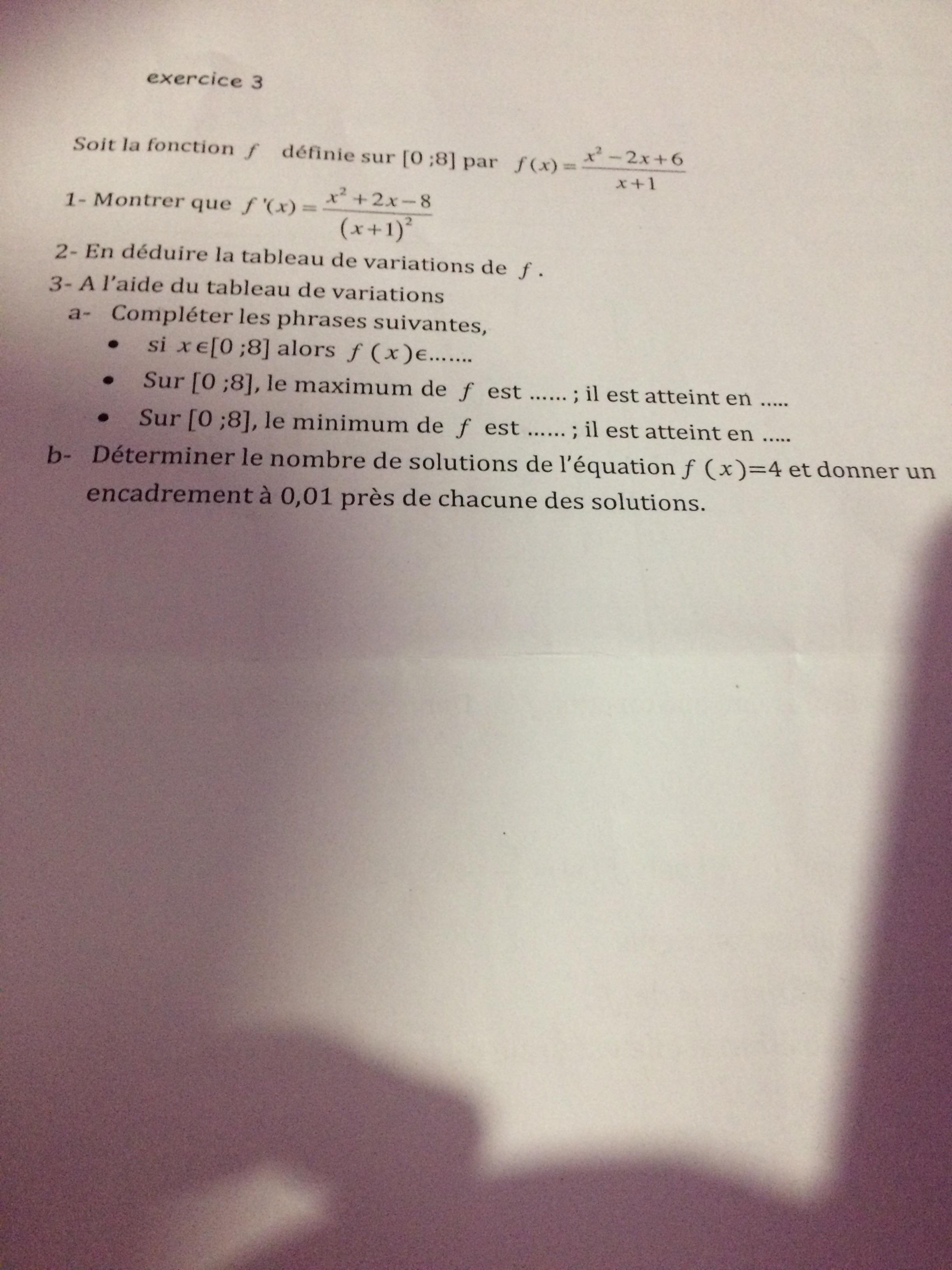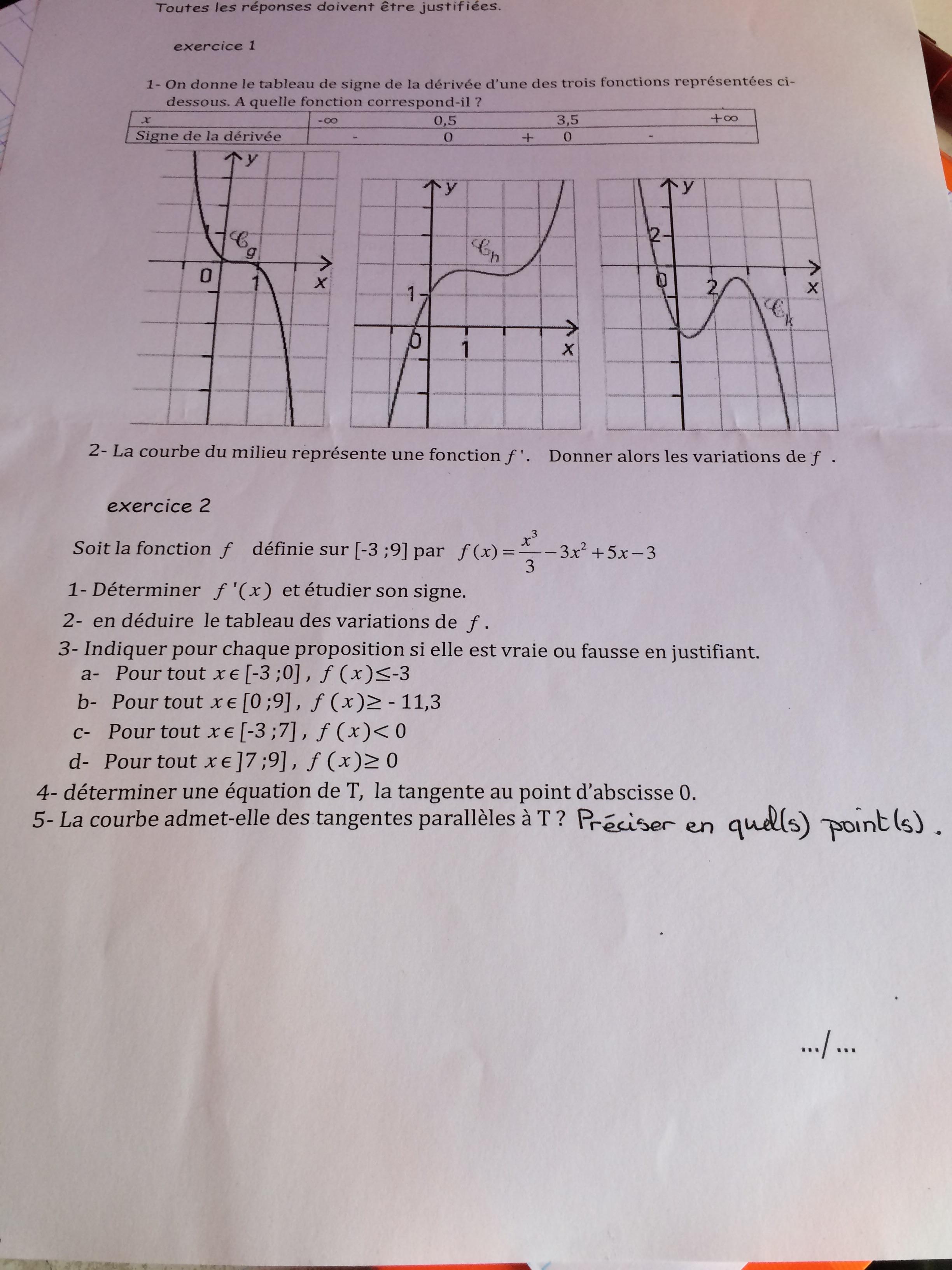 E-Bahut PAVE Posté(e) le 7 mai 2017 E-Bahut Signaler Posté(e) le 7 mai 2017 Citation depuis quelques jours Fichtre diable !! Tu as du oublier de desserrer le frein à ma...ths. 1 1. Tu as le signe de la dérivée donc tu peux en déduire le sens de variation de la fonction. En regardant si la fourmi qui se balade sur les courbes données de gauche (-oo) à droite (+oo), tu sauras si ça monte ou si ça descend 1 2. Elémentaire..... 2 1. Ne sais tu pas calculer la dérivée d'un polynôme ? Regarde un peu dans ton cours, c'est... la base. Relis ton cours et essaye de l'appliquer. Si tu nous dis ce que tu as fait et obtenu, on t'aidera à corriger tes incompréhensions du cours.