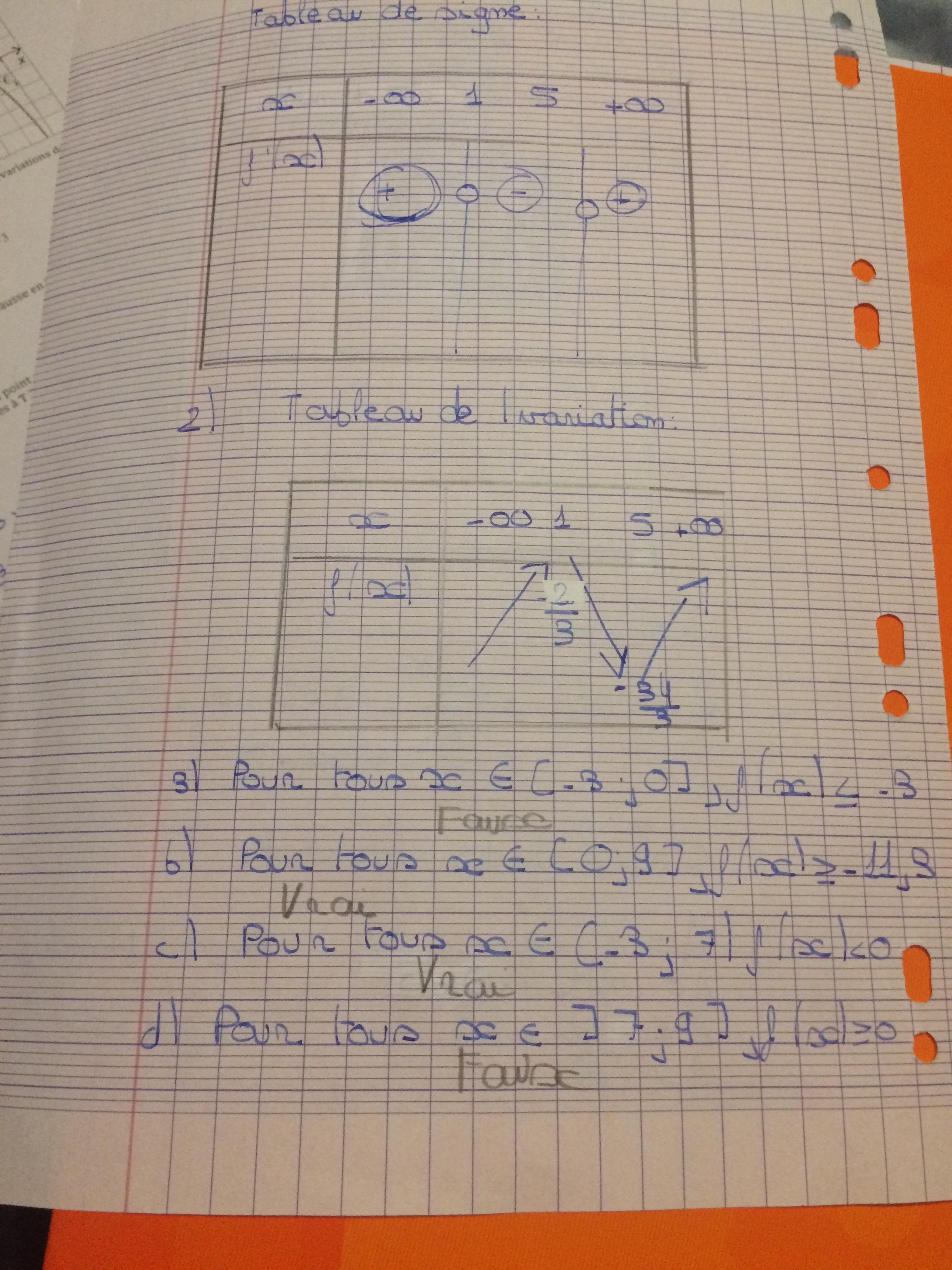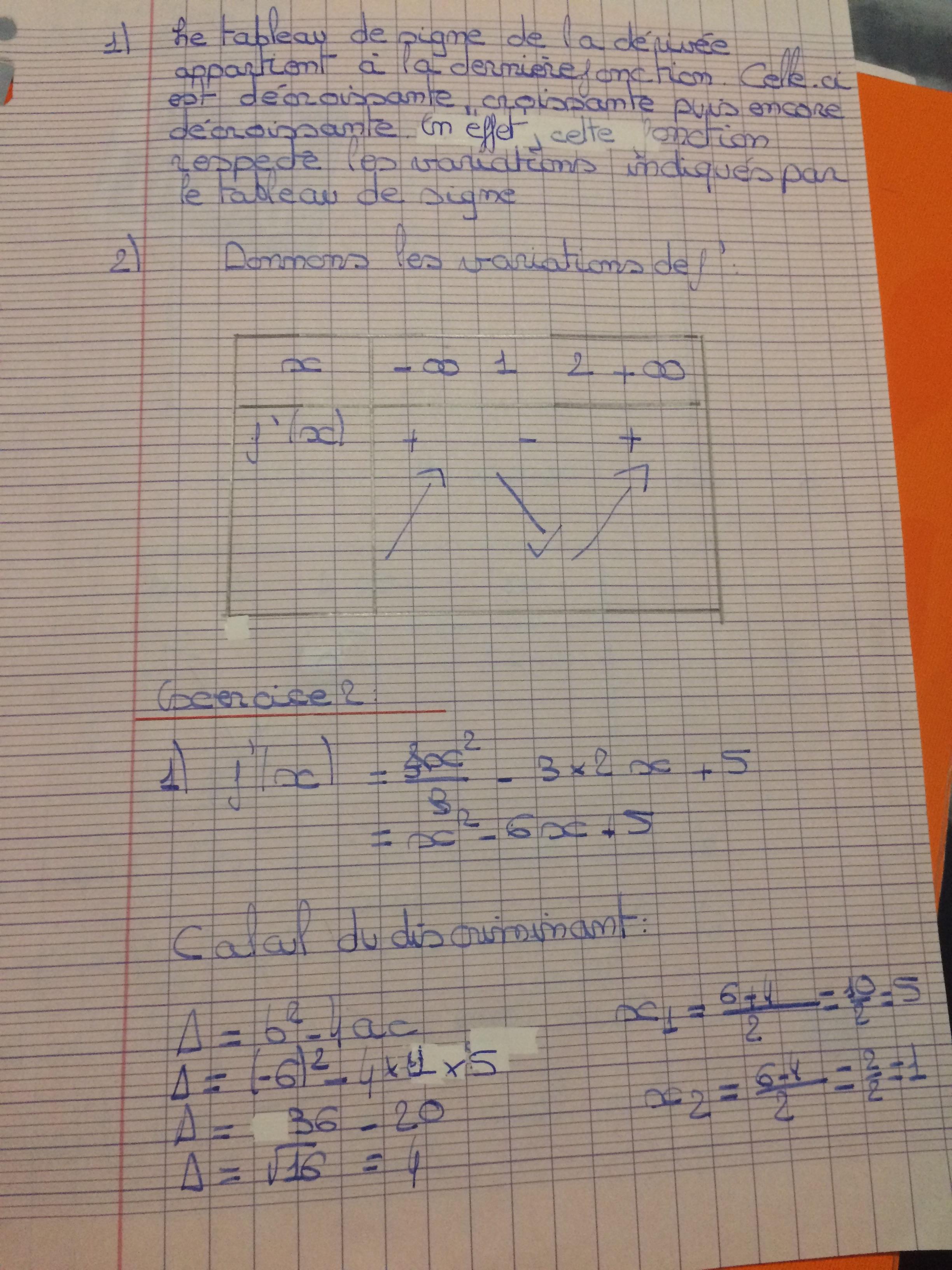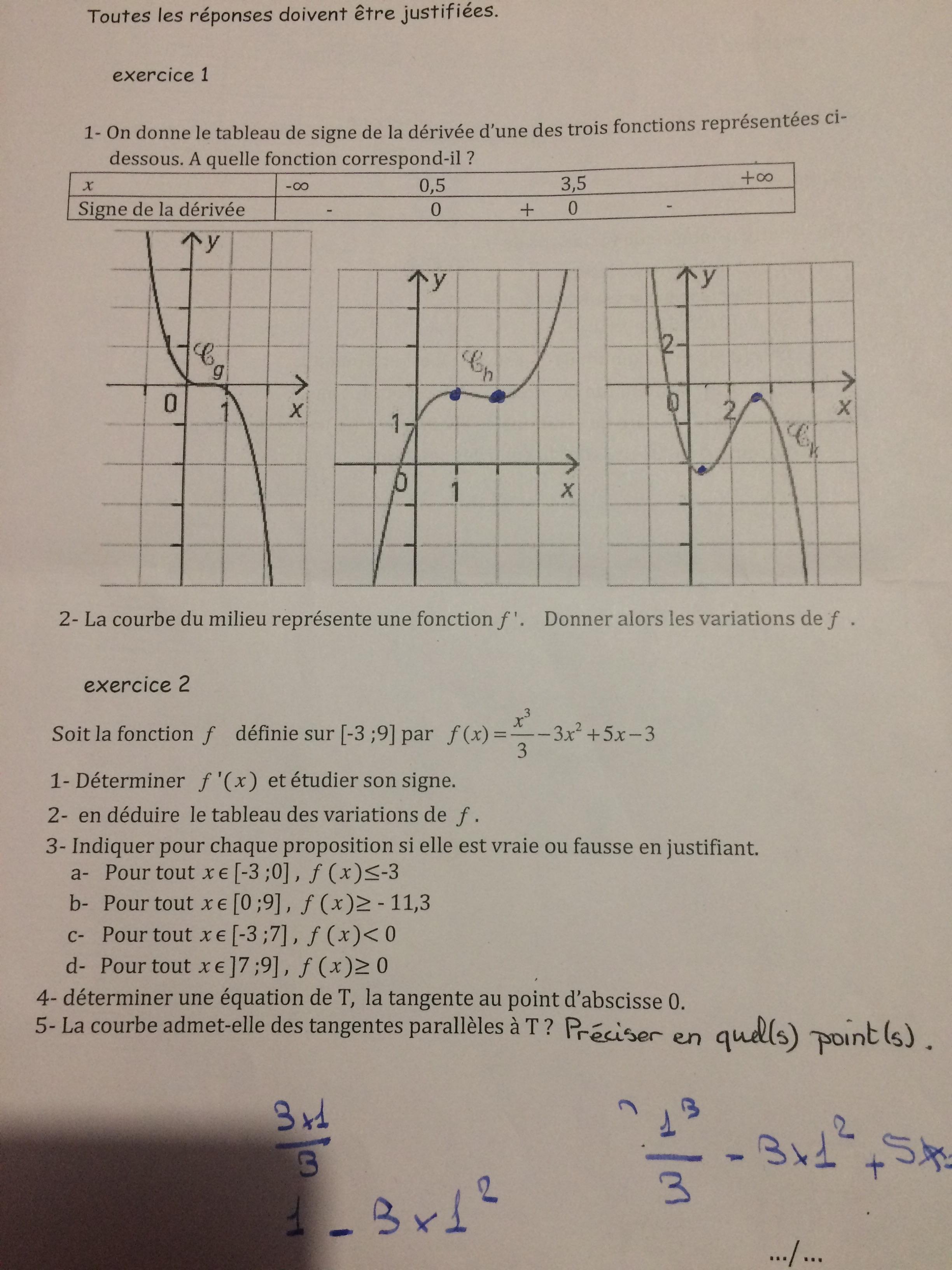 Ryan1212 Posté(e) le 12 mai 2017 Signaler Posté(e) le 12 mai 2017 Bonsoir à tous, j'aurais besoin d'aide pour qu'on me corrige mon Dm de math et qu'on m'explique les deux dernières questions. merci à tous d'avance. Pour la question une de l'exercice 1 je ne sais pas comment justifier. Pour la question deux de l'exercice un je ne suis pas sure . concernant l'exercice deux je voudrais bien qu'on me corrige mes tableaux de variation et mes dérivées. La question trois me paraît compliqué car je n'arrive pas à justifier mes réponses.