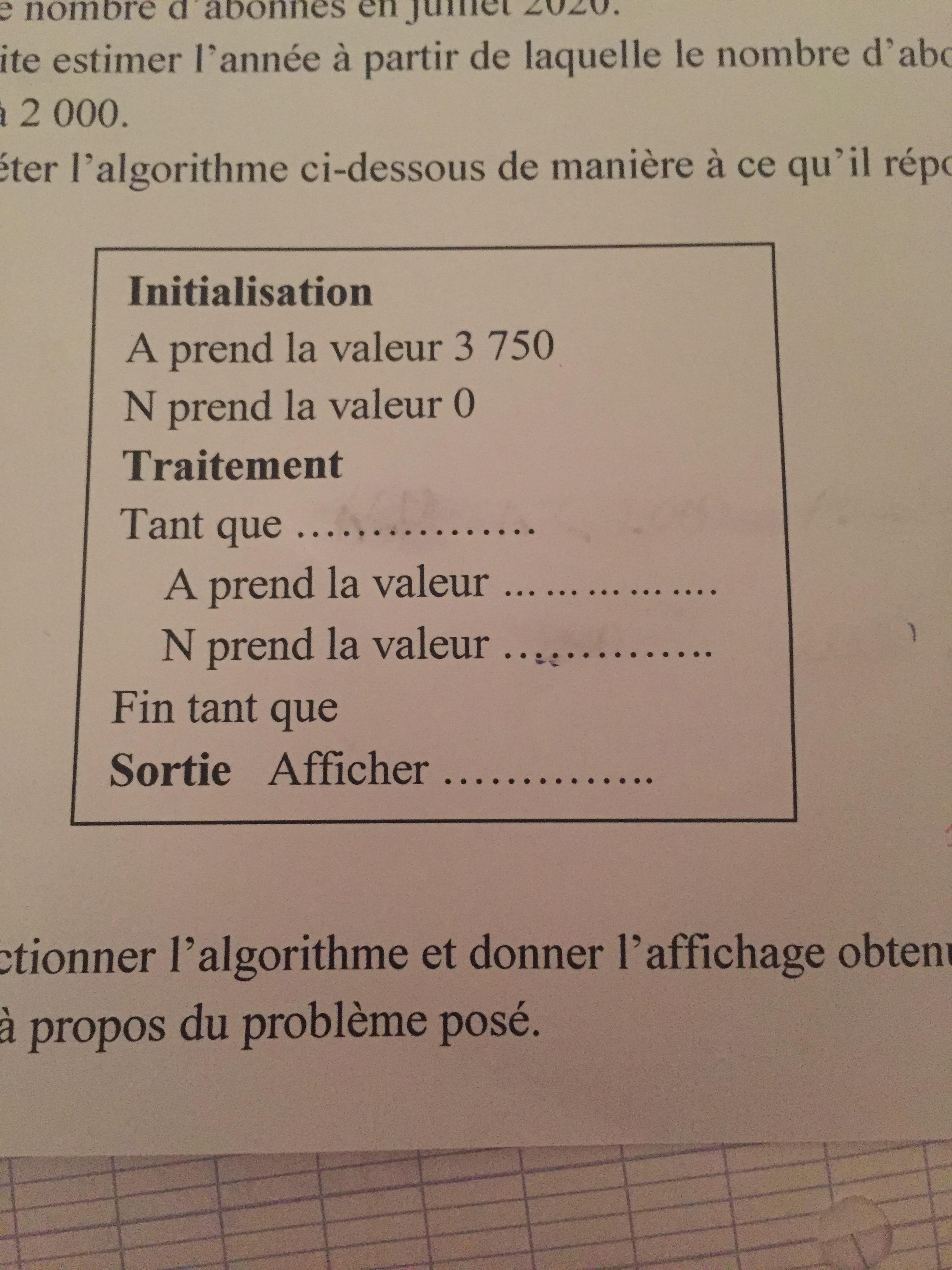 Oceann Posté(e) le 17 mai 2017 Auteur Signaler Posté(e) le 17 mai 2017 Désolée de encore vous dérangez voici l'algorithme qui faut faire fonctionner pour estimer l'année à part de laquelle le nombre d'abonnés sera inférieur à 2000, pouriez-vous m'orienter pour que je le complète? Pour le moment j'ai mis " tant que A<2000" après je bloque