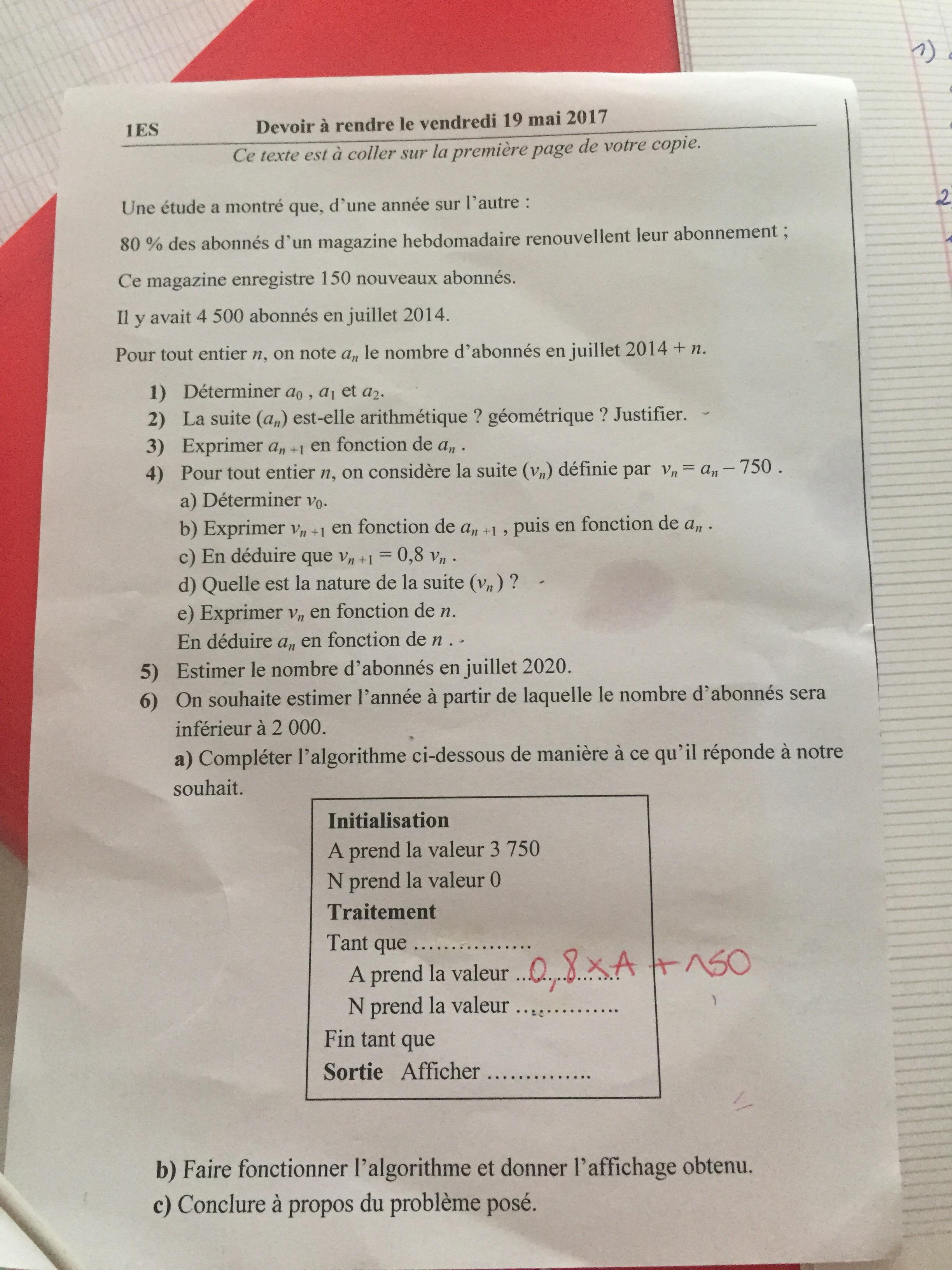 E-Bahut julesx Posté(e) le 18 mai 2017 E-Bahut Signaler Posté(e) le 18 mai 2017 Pour moi, l'énoncé n'est pas si flou que cela. 6) On souhaite estimer l'année à partir de laquelle le nombre d'abonnés sera inférieur à 2000. a) Compléter l'algorithme ci-dessous de manière à ce qu'il réponde à notre souhait. Moi, j'aurais mis "Afficher 2014+N". Cela ne résout évidemment pas le problème des conditions initiales.