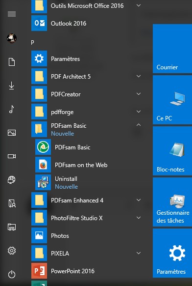 Mr PAPILLON Posté(e) le 27 mai 2017 Signaler Posté(e) le 27 mai 2017 Re. Pour obtenir l'icône de "PDF Sam Basic" sur le bureau, dans W10 : Démarrer >> Faire défiler tous les programmes jusqu'au programme PDF Sam Basic >> Clic Gauche pour ouvrir le dossier >> Sur la première ligne, tu as l'image de l'Icône >> Tu déposes ton pointeur sur l'image >> Clic et maintenir le clic >> Déplacer le pointeur avec l'image de l'icône sur le bureau >> Lâcher le clic, c'est fini.