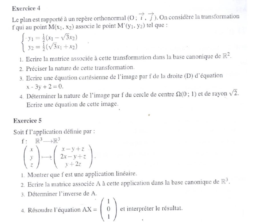 Invité Posté(e) le 11 juin 2017 Signaler Posté(e) le 11 juin 2017 Pour 4-3 et 4-4, vous pouvez aussi exprimer les anciennes coordonnées d'un point en fonction des nouvelles et remplacer dans les équations données. C'est plus rapide pour ce qui est de la droite, mais moins rapide pour le cercle. Le anciennes coordonnées sont obtenues au moyen de la matrice inverse qui est la transposée de la matrice de rotation (matrice orthogonale). Cela revient à faire tourner les axes de -θ, la droite (D) restant fixe .