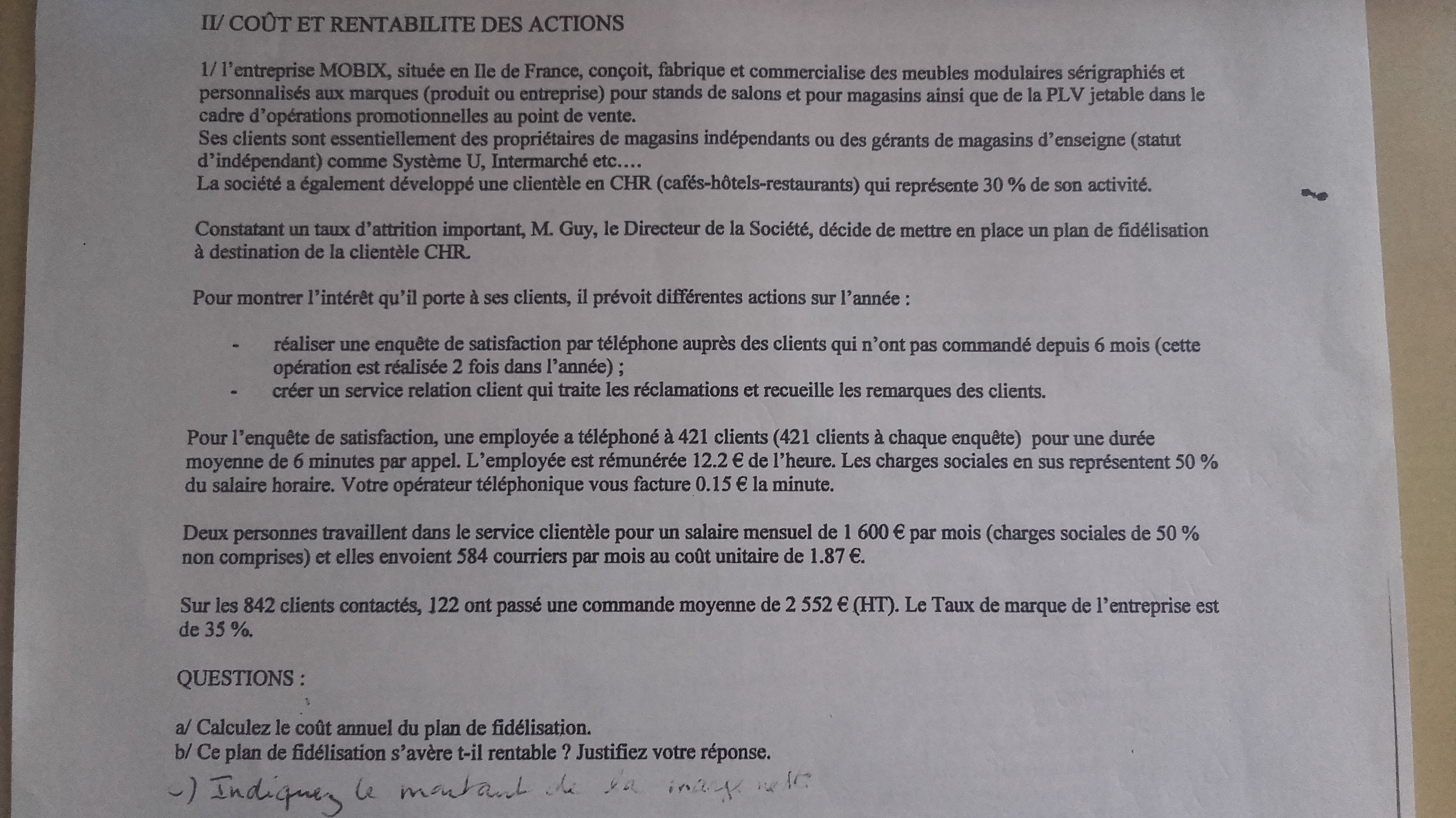 hyuna Posté(e) le 29 août 2017 Signaler Posté(e) le 29 août 2017 - 421 clients x 6 min d'appel : 2526 min; 2526 min / 60 = 42,1 = 0,1 x 60 = 6min = 42h6minUn employée prend 42h6min au total pour contacter les clients- 12,2€ de l'heure : 12,2€ x 42h = 512,40€L''employée est rémunéré 512,40€ au total pour ses heures passés- 2526min x 0,15€ : 378,9€La facture téléphonique est de 378,9€- 1 600€ x 12 = 19 200€Les deux personnes travaillant dans le service client¨le gagnent 19 200€ à l'année- 584 courriers x 12 mois = 7008 courriers7008 x 1,87€ = 13 401,96€Le total d'envoi des courriers à l'année est de 13 401,96€- 2 552€ / 122 clients = 20,92€Un client a dépensé en moyenne 20,92€Pour la question 1 je ne comprend pas comment on prend en compte les charges sociales qui représentent 50% du salaire horaire de l'employée et le taux de marque de l'entreprise de 35%. Comment faut -il procédé?