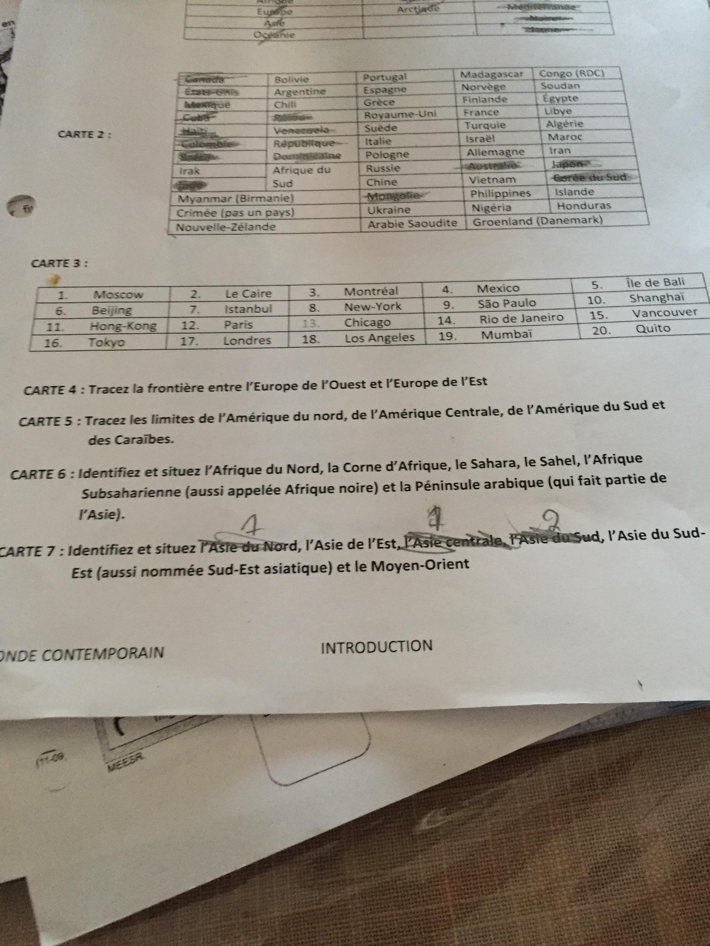 MrX Posté(e) le 8 septembre 2017 Signaler Posté(e) le 8 septembre 2017 Bonsoir Alors je vous écris car pour la carte 7 y'en a 3 que je trouve pas L'Asie de l'est,l'Asie du sud-est et le moyen orient généralement dans ça Je laisse une ligne à ceux que ça m'a été difficile à trouver ceux que j'ai trouvé difficile de plus c'est la seul carte qui me reste à compléter. Finalement j'ai mis aussi un code avec 1 et 2pour que vous voyez où est ce que j'ai mis l'Asie du nord et l'Asie centrale car je ne suis pas sur de leur position Merci de votre aide.
