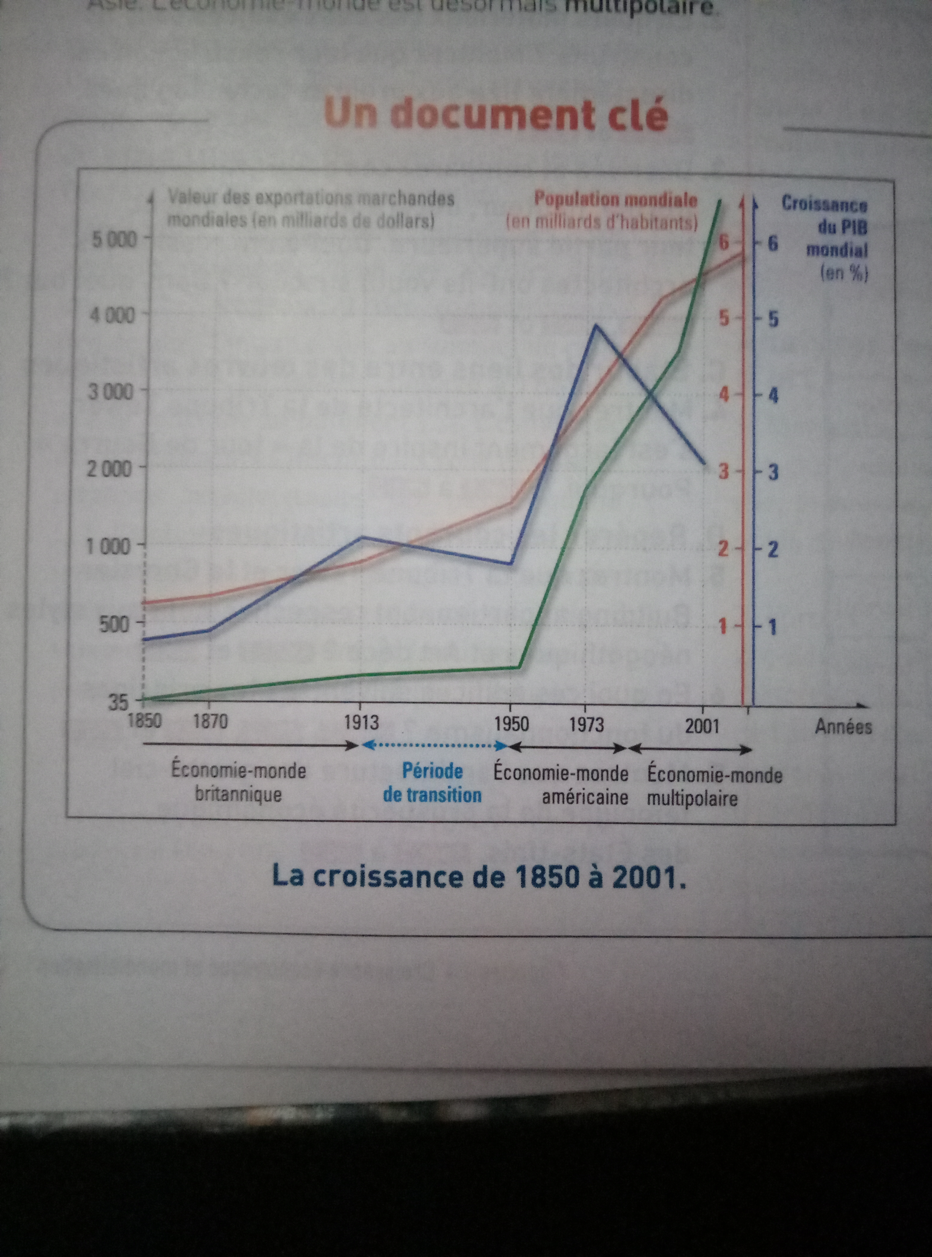 E-Bahut Mamy Posté(e) le 13 septembre 2017 E-Bahut Signaler Posté(e) le 13 septembre 2017 il semblerait que la courbe verte correspond au volume d'exportations. Tu vois qu'à partir de 1950 ( fin de la 2° Guerre mondiale, relance de l'économie ) les exportations n'ont cessé de croître , ( mondialisation, transports plus faciles). Alors qu’auparavant les pays vivaient plutôt en autarcie.