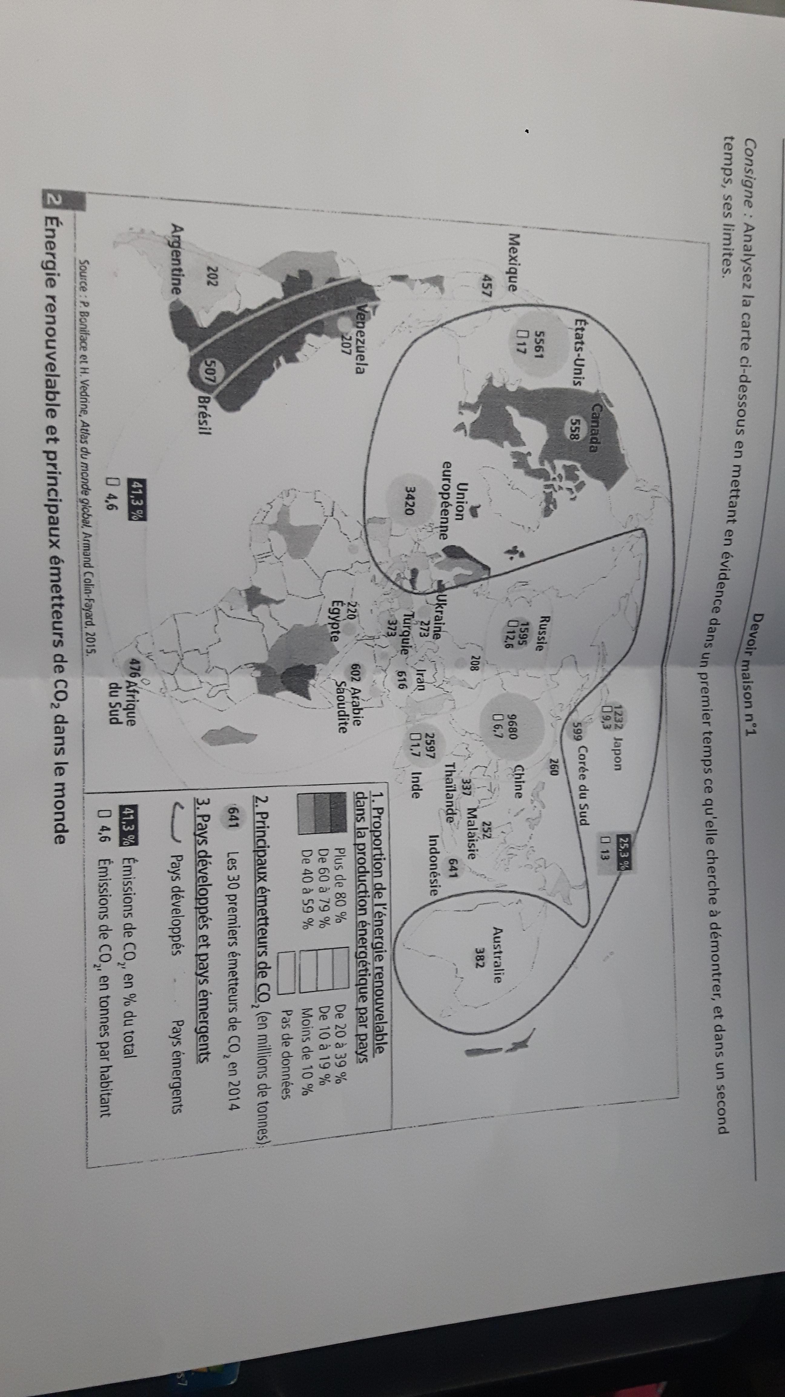 chacha778 Posté(e) le 16 septembre 2017 Signaler Posté(e) le 16 septembre 2017 Bonjour à tous, j'ai un dm de géographie à faire et je voulais être sur d'avoir bien compris et réussi mon devoir Consigne: analyser la carte ci-dessous en mettent en évidence dans un premier temps ce qu'elle cherche à démontrer, et dans un second temps, ses limites Carte d'énergie renouvelable et principaux émetteurs de CO2 dans le monde (source: P.Boniface et H.Vedrine, Atlas du monde global, Armand Colin-Fayard,2015) - Les principaux états émetteurs de CO2 sont les pays les plus développés : Canada, états-unis, Union européenne, Australie mais plus particulièrement la Chine -Les états à faibles émissions sont les pays les plus pauvres -Brésil + Canada : plus de 80% de production de CO2 = pays émergents ( qui rattrapent les pays développés) -Les pays émergents = 41,3% d'émission de CO2 contre 25,3% pour les pays développés - 4,6 tonnes de CO2 par habitants pour émergents contre 13tonnes pour développés Je ne vois pas trop quoi dire enfaite. Je vous joins la carte ci-dessous pour si possible avoir de l'aide, merci d'avance !