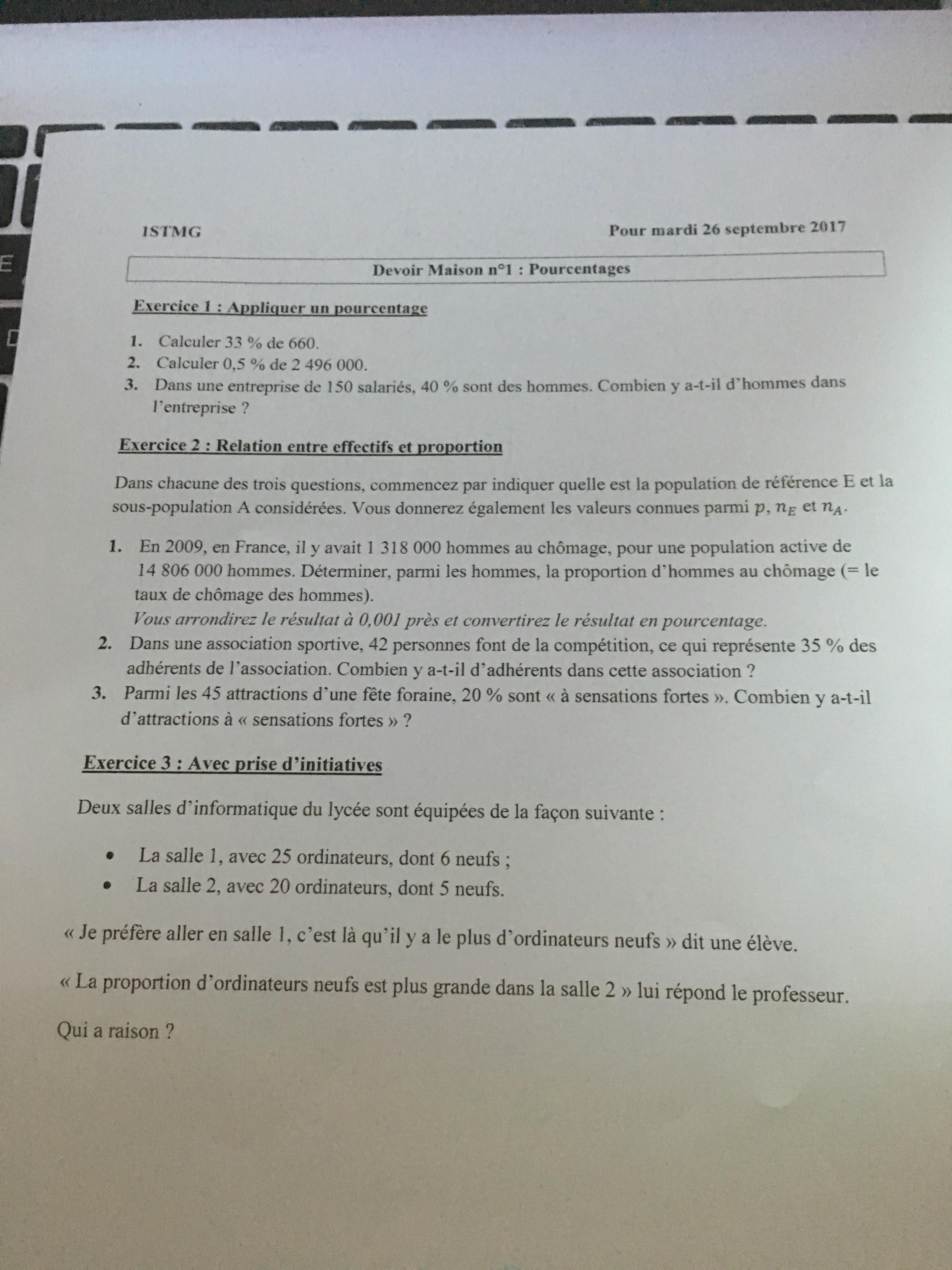 volcano47 Posté(e) le 23 septembre 2017 Signaler Posté(e) le 23 septembre 2017 2) x personnes sur N adhérents font de la compétition. On nous dit que x/N = 35% ce qui signifie 35/100 ou 0,35. donc x/N = 0,35 , je pense que tu en tireras N. 3) N attractions au total dont y "sensations fortes" c'est le même principe , mais là, on connaît N et on cherche y.