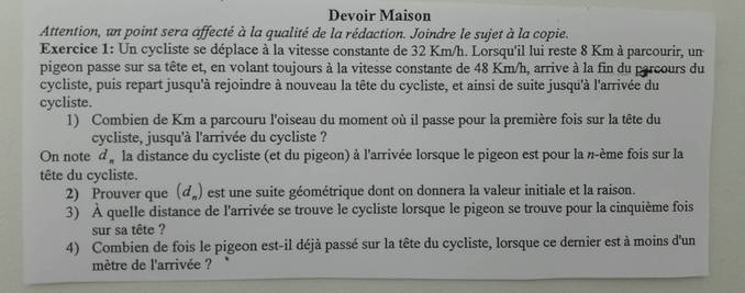 E-Bahut Barbidoux Posté(e) le 23 octobre 2017 E-Bahut Signaler Posté(e) le 23 octobre 2017 il est demandé la distance parcourue par le pigeon entre le moment où il passe la première fois sur le cycliste jusqu'à son arrivée, et comme il reste 8 km à parcourir pour le cycliste .... Question simpliste dont le rôle est de fournir le premier terme d1 de la suite dn. Mais si l'on comprend que l'on demande la distance totale parcourue par le pigeon jusqu'à l'arrivée du cycliste au terme de son parcours il faut répondre 8*48/32=12 km le temps étant le même pour le cycliste que pour le pigeon.