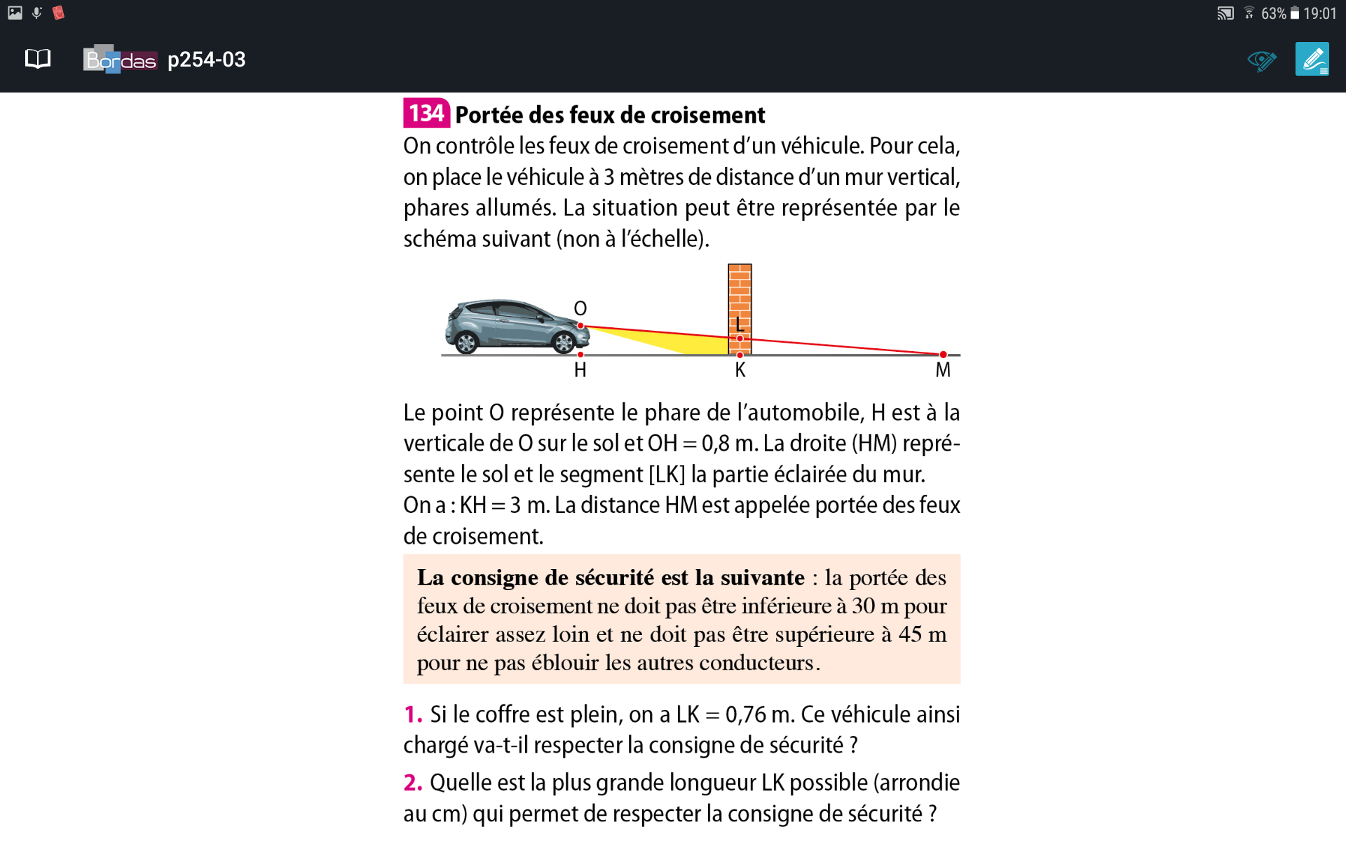 E-Bahut Denis CAMUS Posté(e) le 24 octobre 2017 E-Bahut Signaler Posté(e) le 24 octobre 2017 On place le véhicule à 3 mètres de distance du mur. Pour la portée mini, KM = 30 - 3 = 27m. Pour la portée maxi, KM = 45 - 3 = 42m.