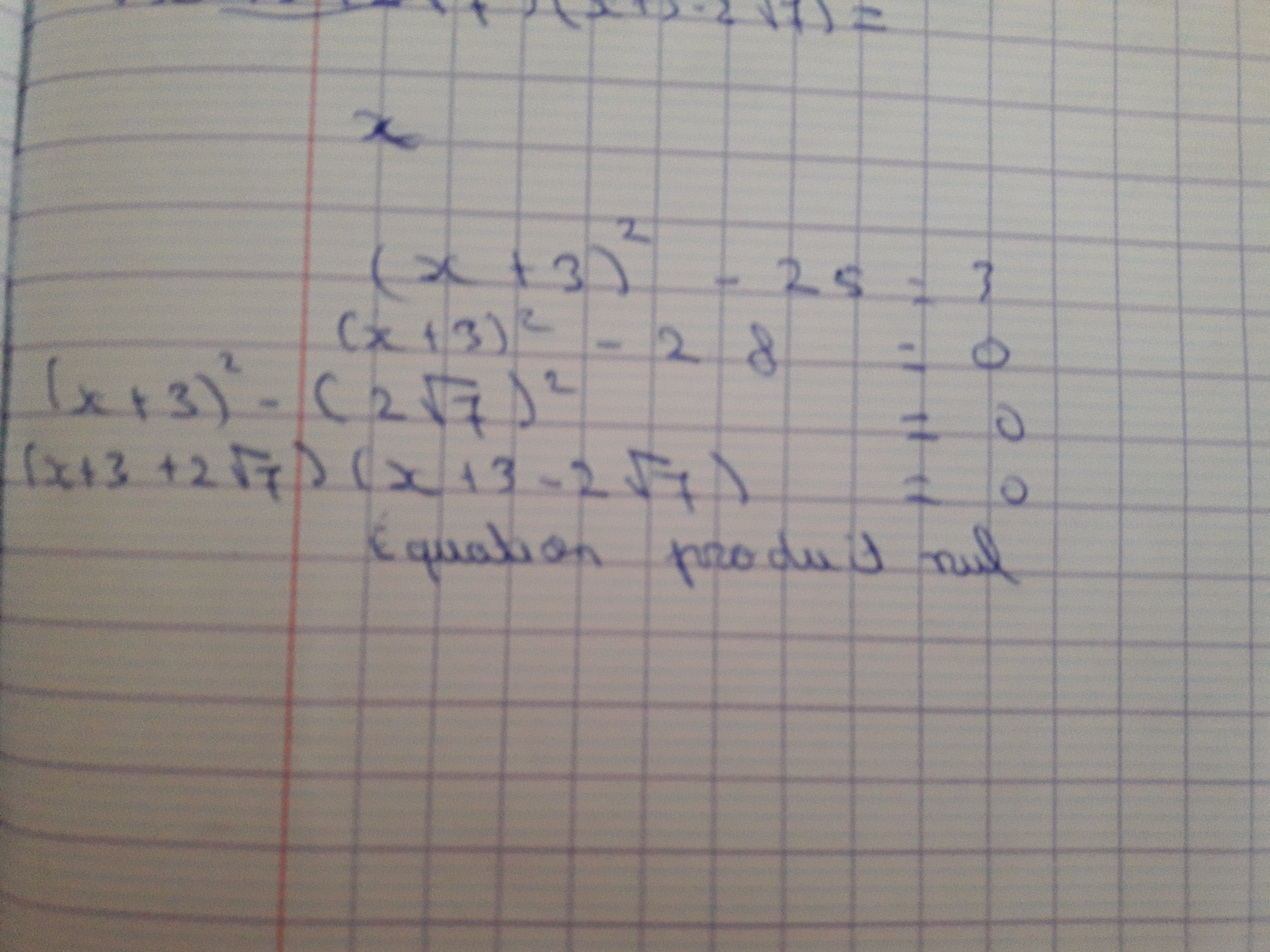 E-Bahut PAVE Posté(e) le 27 octobre 2017 E-Bahut Signaler Posté(e) le 27 octobre 2017 Exercice 1 question 3 !!!! il y a 5 minutes, Dan-nul-maths a dit : Arrivé à cette étape je suis bloquée je ne sais pas comment soustraire des racines Tu as fait le plus dur... A*B = 0 <==> A= 0 ou B= 0 x+3+2V7 = 0 ou x+3 -2V7 = 0 d'où x = -3-2V7 ou x =..... L'équation a 2 solutions S = {-3-2V7 ; -3+.... A toi de finir. Exercice 2 équation 3 !!!! Citation Pour le dernier avec les racines j'ai vu la troisième identité remarquable mais arrivé à un niveau les racines m'embrouille Puisque tu sais scanner ce que tu as écrit, fais le avec cet exercice. on va voir où cela coince...