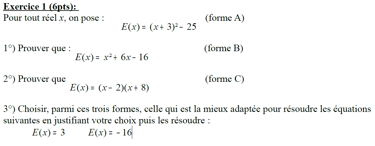 E-Bahut PAVE Posté(e) le 27 octobre 2017 E-Bahut Signaler Posté(e) le 27 octobre 2017 Bonjour à tous, 1) Conseils préliminaires : Tu ne devrais pas mettre en ligne ton devoir complet. Poste un exercice par message... 3 exercices donc 3 messages !! Tu auras ainsi plus de chance d'avoir des intervenants divers... Et surtout pour chacun des exercices dis nous ce que tu as fait ou essayé de faire ; ainsi on verra que tu as bien cherché des solutions et surtout à travers tes erreurs, nous , on verra mieux où se situe ton problème. 2) Je prends en charge ton exercice 1 : Tu as fait les questions 1 et 2 ! très bien mais tu n'as a pas eu grand mérite puisque les réponses étaient données par l'énoncé J'espère que tu as vu que l'expression E(x) telle qu'elle t'est donnée est sous une forme "intermédiaire" entre sa forme développée B et sa forme factorisée C. E(x) est un polynôme du second degré. Pour la question 3) si ton problème est de choisir la forme la mieux adaptée, je te suggère de faire avec les 3 formes et de choisir a postériori celle qui a permis d'arriver le plus simplement à la solution. Par exemple pour E(x) = 3, tu résous (enfin tu essayes) successivement (x+3)²-25 =3 puis x²+6x-16 = 3 (là cela va être mission impossible si tu n'as pas appris à résoudre les équations du second degré ax²+bx+c = 0 et en principe on voit cela en 1ère) puis (x-2)(x+8) = 3