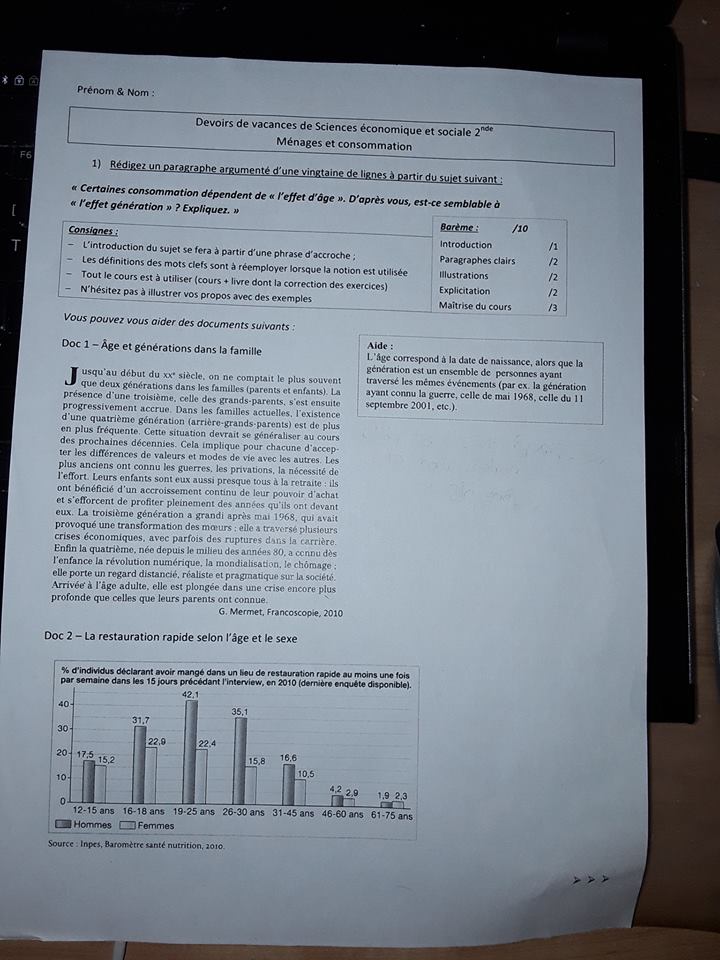 Lili42 Posté(e) le 31 octobre 2017 Signaler Posté(e) le 31 octobre 2017 Bonjour, J'ai un DM de SES à faire pendant ces vacances. Or, je ne suis pas très douée dans cette matière . J'aurai donc besoin de votre avis et/ou aide sur ce que j'ai rédigé : Composé d'un texte, le premier document s'intitule "Age et générations dans la famille". Ce texte a été écrit par G.Mermet en 2010, et est paru dans la Francoscopie. Le deuxième document contient un graphique, et se nomme "La restauration rapide selon l'âge et le sexe". Il provient de l'inpes, baromètre santé nutrition, 2010. Si ces document s'attardent sur les générations et sur l'âge, c'est parce qu'ils ont des conséquences sur la consommation. Est-ce que l'effet d'âge est semblable à l'effet génération ? Sinon, quelles sont leurs différences ? Pour commencer, nous définirons les deux effets cité ci-dessus tout en les comparant. Nous finirons par donner des exemples pour chacun des deux effets. L'effet d'âge correspond aux différentes consommations dues à l'âge. La consommation se maintient avec l'âge : Quand on est petit, on a plutôt tendance à consommer plus de chose, mais pas très chère. Alors que quand on grandit, on demande en général, moins de chose que lorsque l'on est enfant; mais elle coûte plus chère. L'effet d'âge est aussi influencé par la mode (diffusion plus ou moins rapide et durable d'une tendance), par l'effet de signe (fonction sociale jouée par la consommation de biens ou de services qui permet à un individu d'afficher ses goûts et ses valeurs.), d'imitation (consommation en vue de montrer son appartenance ou son désir d'appartenance à un groupe social), ou de distinction (consommation en vue de montrer un refus d'appartenance à un groupe social).L'effet de génération, peut se traduire par la consommation concernant les personnes d'une même tranche d'âge (sachant qu'une nouvelle génération apparaît tous les 10 ans). La consommation augmente avec les générations : Plus on avance de générations en génération, plus il y a de nouveaux produits consommables qui font leur apparition. Tous mieux que les précédents. Les plus anciennes génération, pour la plupart, consomment bien moins que les nouvelles. Pour causes, elles ont connues les guerres, les privations (famine), la nécessité de l'effort, du travail..., Les générations les plus récentes consomment beaucoup : Elles en veulent toujours plus. Prenons l'exemple de la restauration rapide (grâce au graphique du sujet) pour illustrer l'effet d'âge. On peut voir, que le pourcentage des personnes âgées de 16 à 30 ans ayant déclaré avoir mangé dans un lieu de restauration rapide au moins une fois par semaine dans les 15 jours précédent l'interview (environ 28,33 % ) est beaucoup plus élevé que les personnes âgées de 46 à 75 ans (environ 2,83%). Il s'agit donc d'une clientèle essentiellement constitué de jeunes adultes et d'adolescent. Voyons un autre exemple : Un enfant, va, en général, consommer des bonbons, jouets,.... Tandis qu’un adulte consommera un logement, une voiture... Donnons des exemples d'effet générations : La troisième génération (celle qui a grandit après mai 1968) "a traversé plusieurs crises économiques, avec parfois des ruptures dans la carrière." Contrairement à la quatrième (née depuis le milieu des années 80) "a connut dès l'enfance la révolution numérique, la mondialisation, le chômage ; elle porte un regard distancié, réaliste et pragmatique sur la société." Donc, la quatrième génération, consomme plus de matériaux informatiques (tablette, ordinateur, portable,....) que les précédentes, qui elles, n'en consomme point. Elles sont restées à la consommation des papiers, stylos, lettres... Pour conclure, l'effet d'âge n'est pas semblable à l'effet génération, même si les deux effets sont assez proche étant donnés que les générations ont un rapport avec l'âge.
