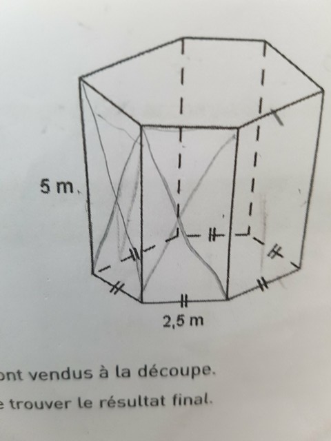 Chrystine Posté(e) le 1 novembre 2017 Signaler Posté(e) le 1 novembre 2017 bonjour, j'aurai besoin d'aide pour cet exercice une véranda a la forme d'un prisme droit à base hexagonale où 2 face latérales sont les portes en aluminium.Les propriétaires souhaitent installer des stores à toutes les vitres. Quelle surface de stores sera necessaire?Détailler les calculs et ecris une phrase réponse. Sachant que 1m² de store coûte 23.90 euros et que chaque barre de fixation coûte 32 euros,combien va côuter la mise en place des stores? remarque: il n'y aura pas de pertes,les stores sont vendus à la découpe. a)Ecris en seule expression le calcul permettant de trouver le résultat final b)Calcul cette expression et ecris une phrase réponse. voici les mesures hauteur=5m Base=2.5*6 Merci d'avance pour votre aide